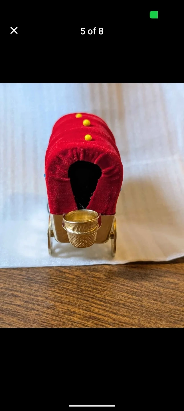 This is a rare cute wagon-shaped pin cushion. It's made with a red velvet material for the wagon cover and has colorful decorative pins. A small gold-tone thimble holder is attached to the back. Includes the original box, which says "Pin Cushion Wagon Pin Cushion".