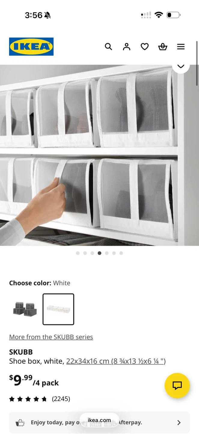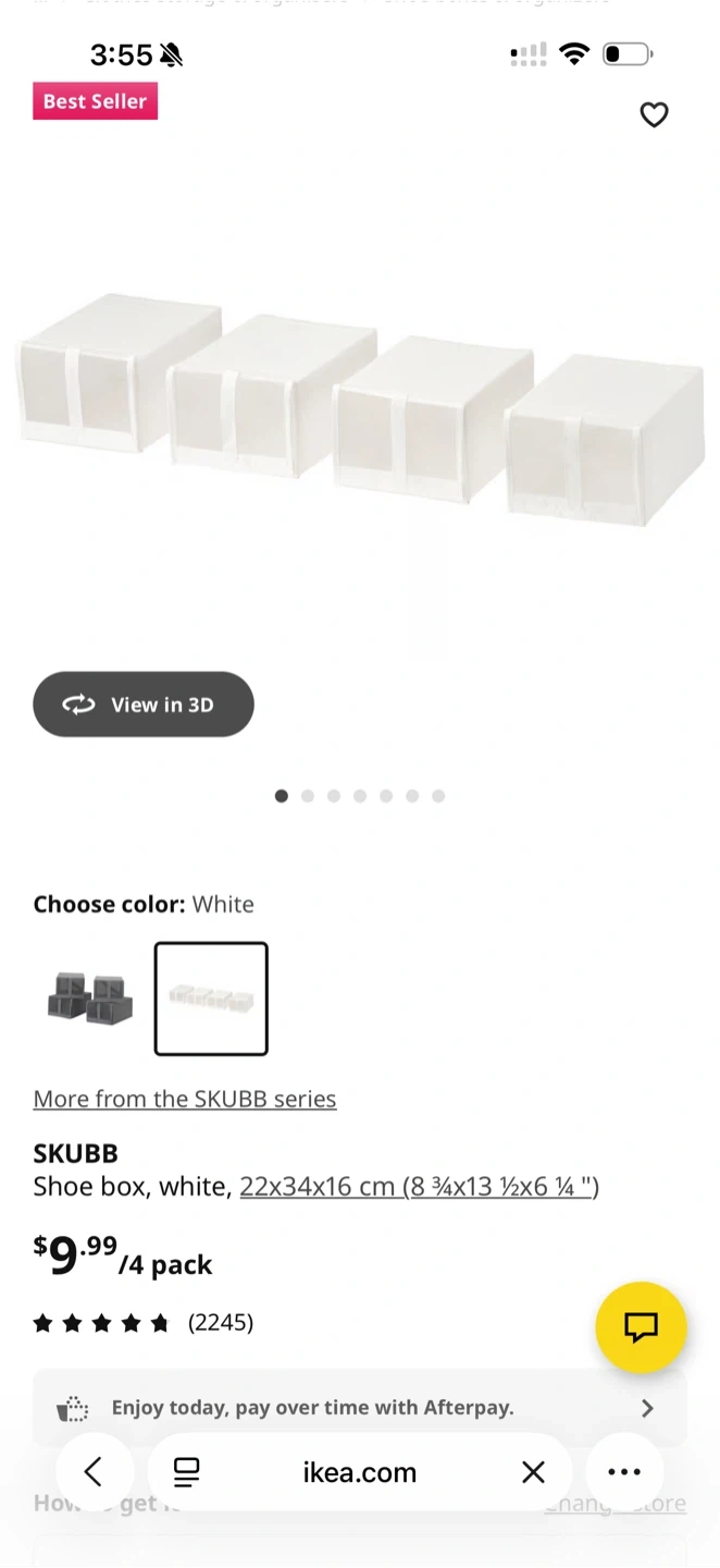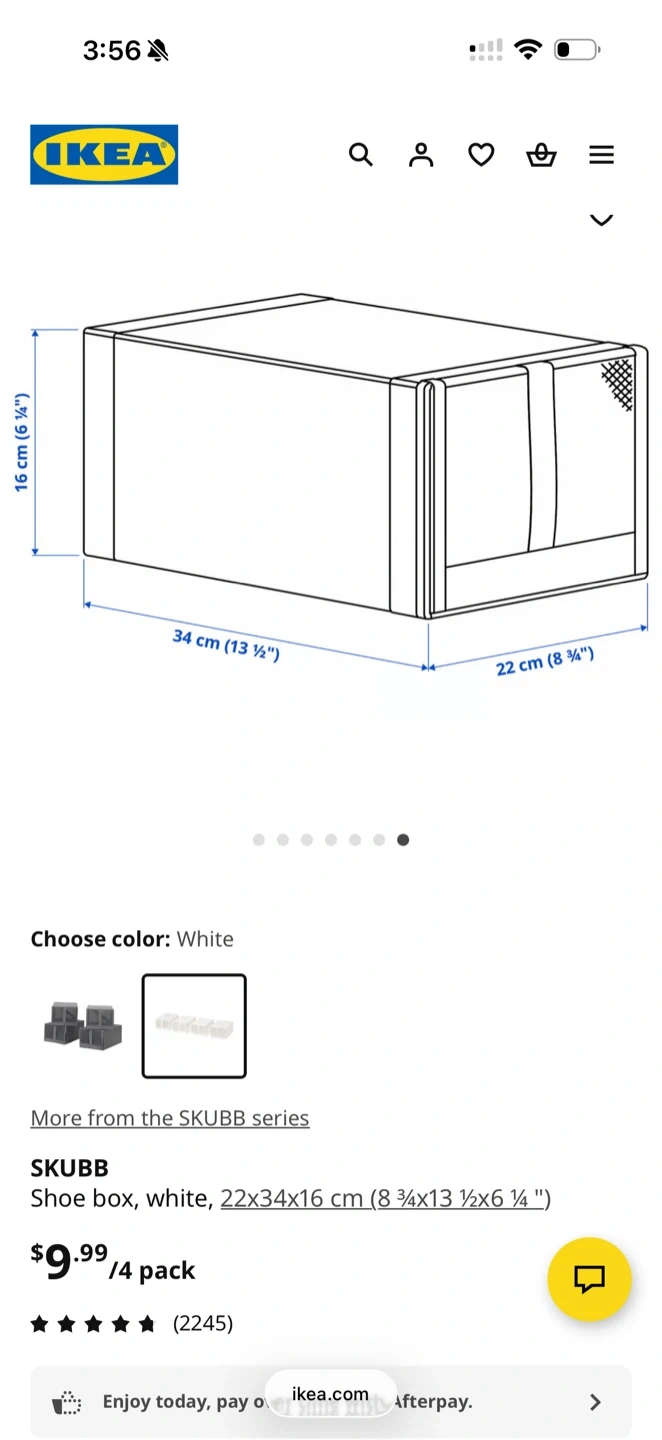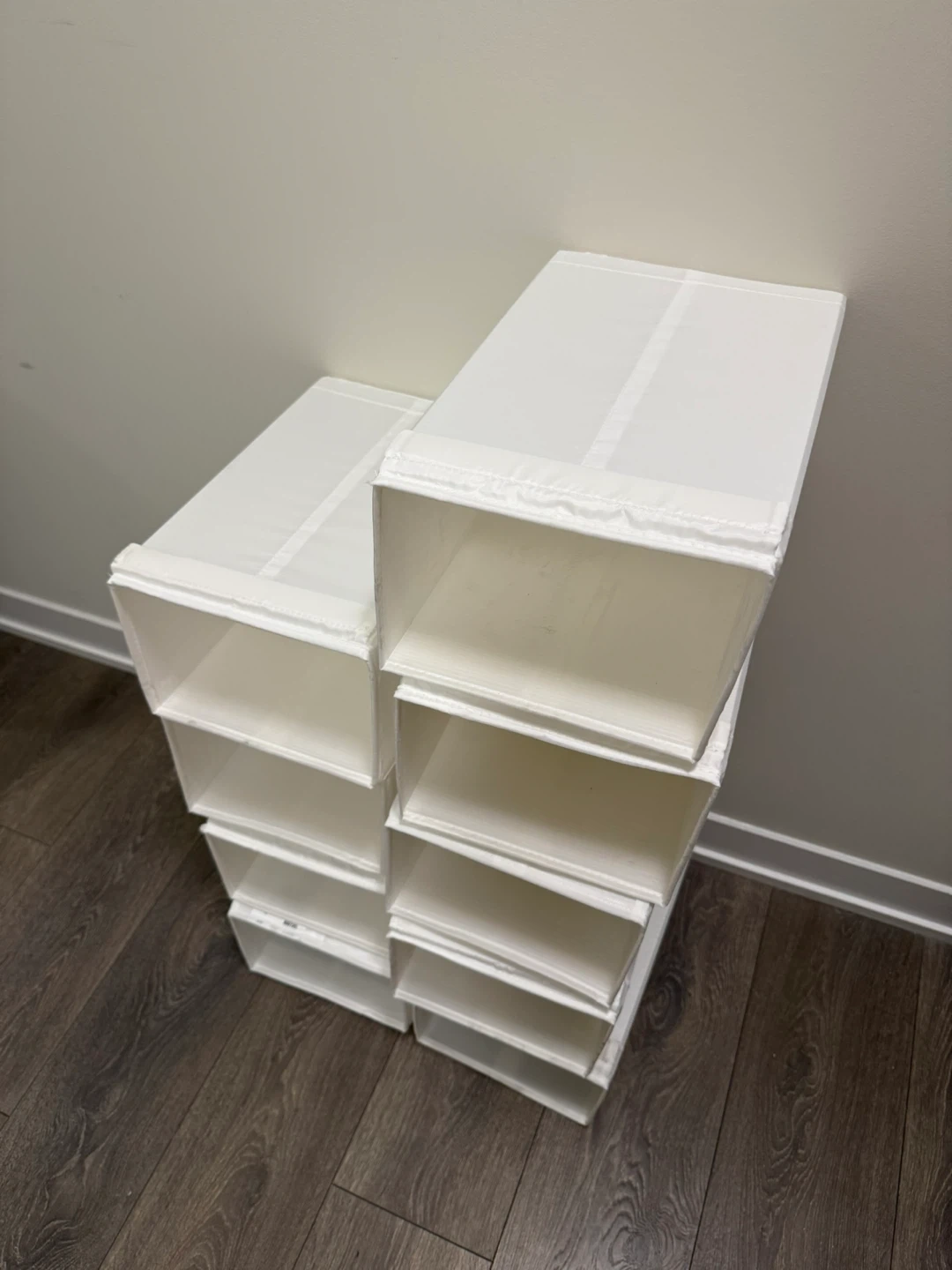 White fabric shoe boxes for storage. Each box measures 22x34x16 cm. They're great for keeping shoes tidy and organized in your closet.