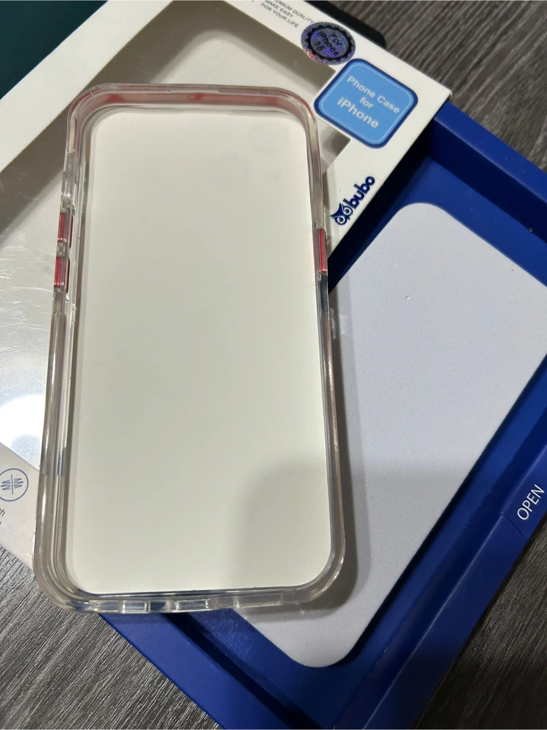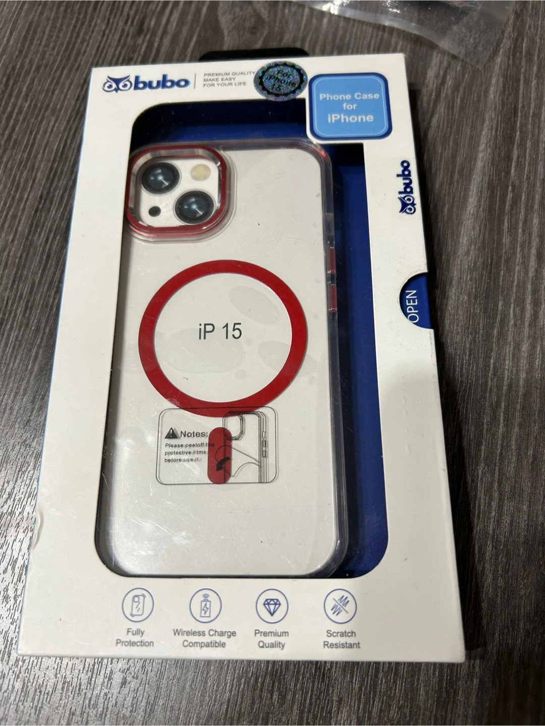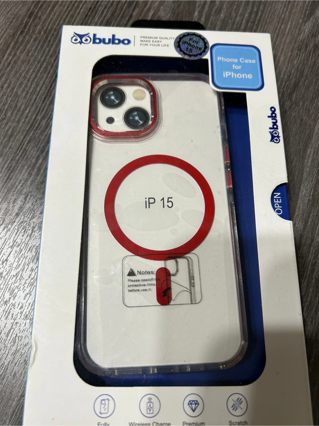 This is a new Bubuo clear phone case designed for the iPhone 15. It offers wireless charge compatibility and scratch resistance. The case comes in its original packaging.