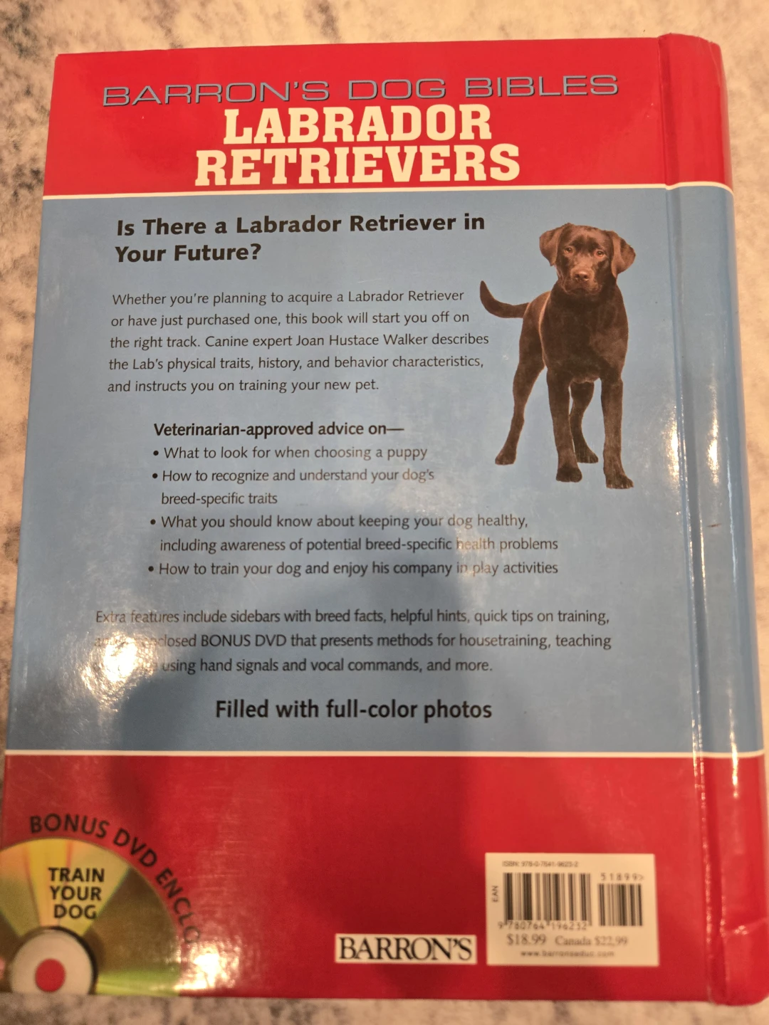 This Barron's Dog Bibles book focuses on Labrador Retrievers, covering topics like choosing a puppy and training. It includes a bonus DVD titled 'Train Your Dog' with training exercises and tips. Full-colour photos are included throughout the book.