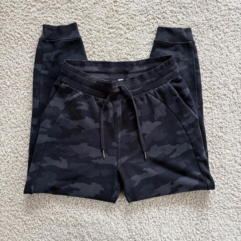 Lululemon Scuba High-Rise Jogger Fleece 28" Length Heritage 365 in Camo Deep Coal Multi. The cozy pants are in very good pre-loved condition. Model photos are included to illustrate fit only. Women's Size 8. 73% Cotton, 24% Polyester, 3% Elastane. Naturally breathable, smooth stretchy elastic waistband, two deep front pockets, no back pockets. Measurements are approx.: Length 98cm, Waist 35.5cm, Hips 54cm, Rise 31cm, Inseam 71cm, Cuff 11cm. Pick up west Maple Ridge.