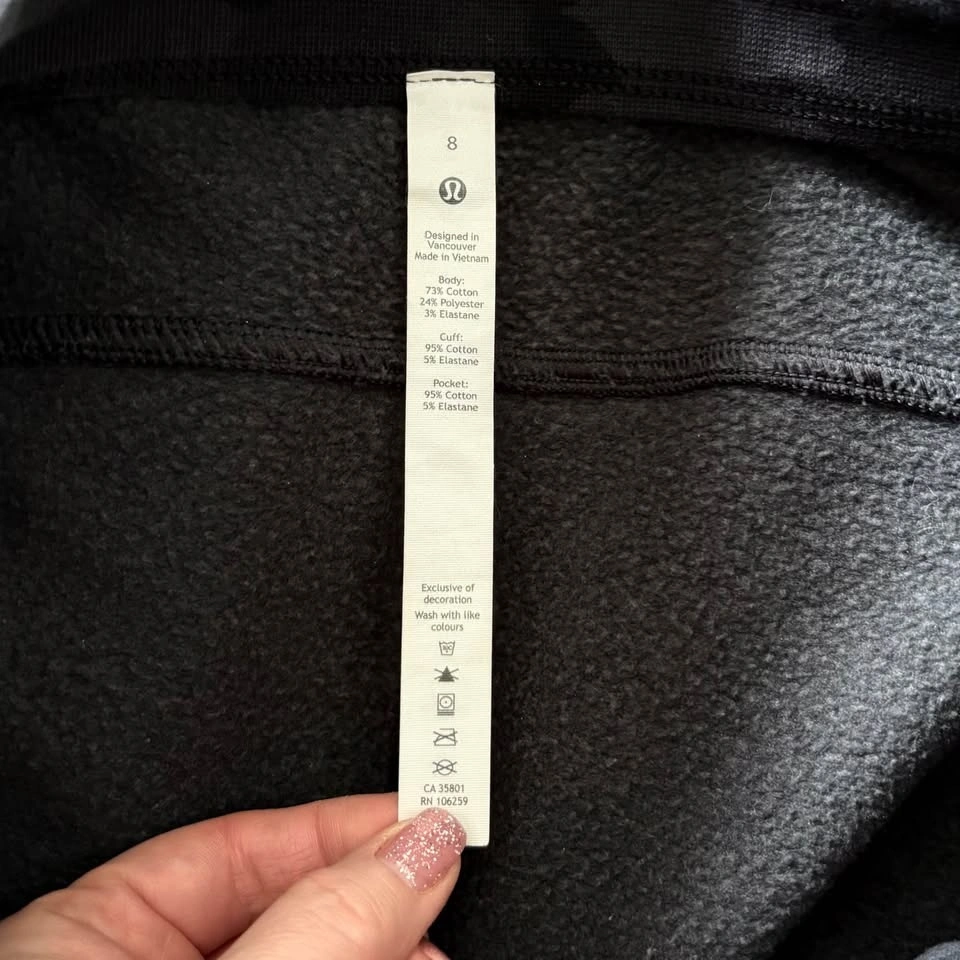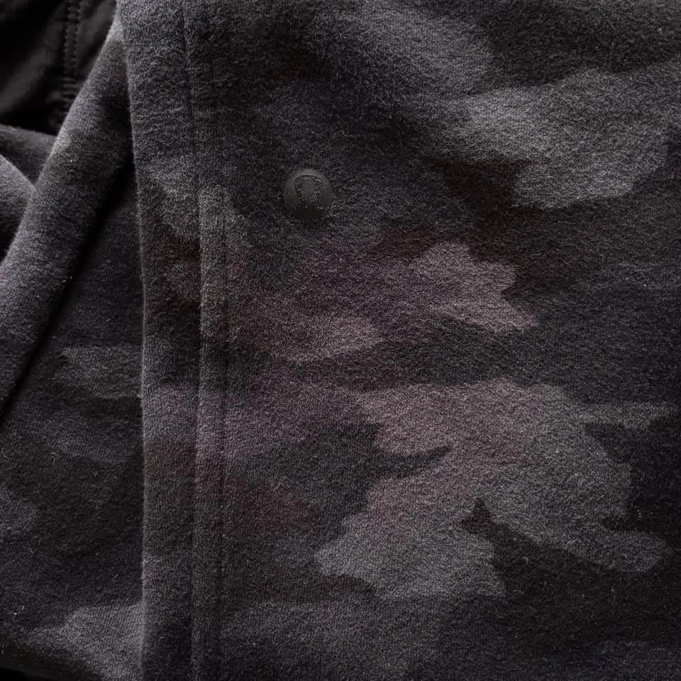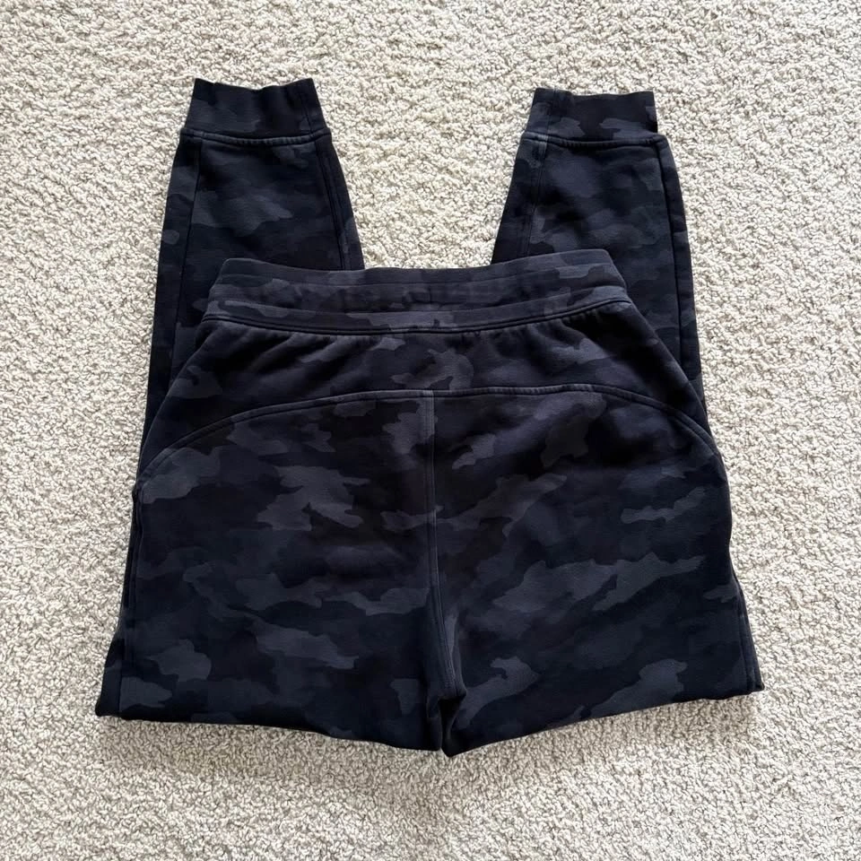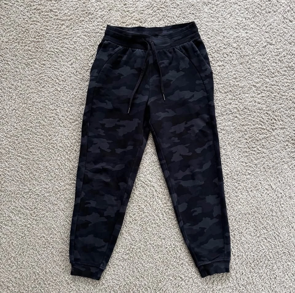Lululemon Scuba High-Rise Jogger Fleece 28" Length Heritage 365 in Camo Deep Coal Multi. The cozy pants are in very good pre-loved condition. Model photos are included to illustrate fit only. Women's Size 8. 73% Cotton, 24% Polyester, 3% Elastane. Naturally breathable, smooth stretchy elastic waistband, two deep front pockets, no back pockets. Measurements are approx.: Length 98cm, Waist 35.5cm, Hips 54cm, Rise 31cm, Inseam 71cm, Cuff 11cm. Pick up west Maple Ridge.