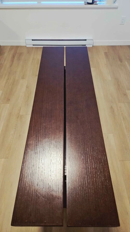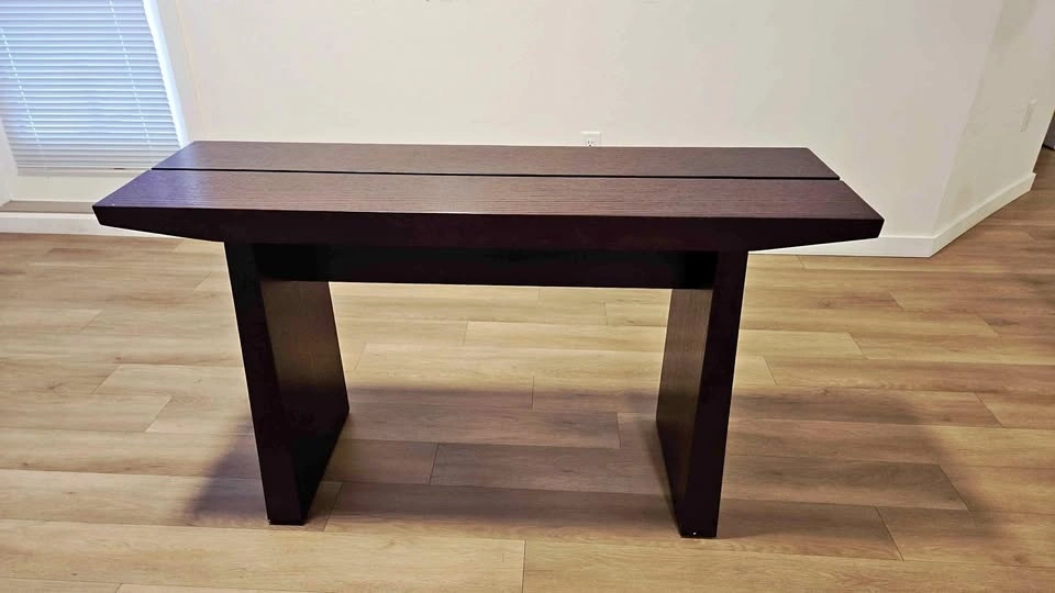 In great shape. A stylish dark wood bench with a modern design. It's made from solid wood and features a rich, deep finish. This bench would fit well in an entryway or as a sofa table. 16” x 52” x 29” high.