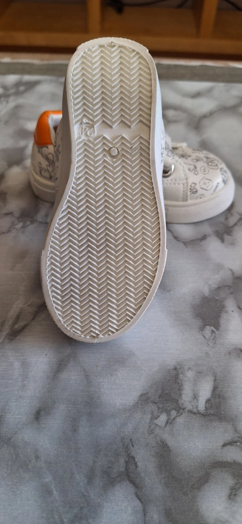 Cute pair of toddler sneakers in a white colour with fun cartoon patterns! They have velcro straps, making them easy for little ones to put on and take off. The interior and heel are accented with a bright orange colour. The size is 24, which is equivalent to a US/CA size 8. Unused