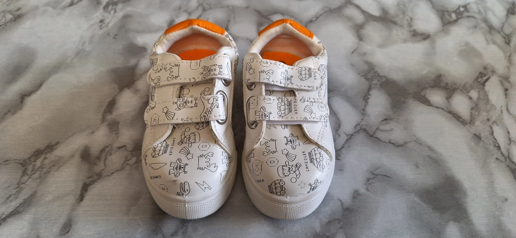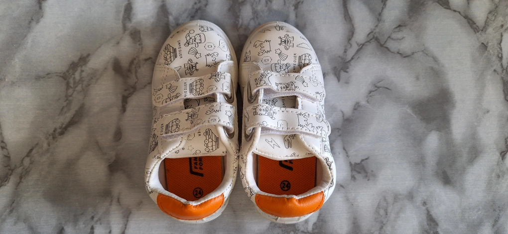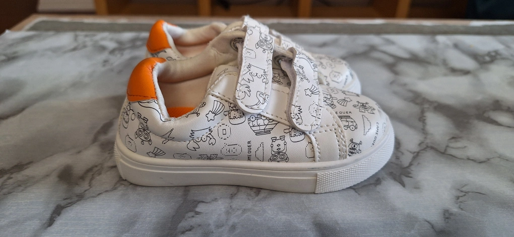 Cute pair of toddler sneakers in a white colour with fun cartoon patterns! They have velcro straps, making them easy for little ones to put on and take off. The interior and heel are accented with a bright orange colour. The size is 24, which is equivalent to a US/CA size 8. Unused