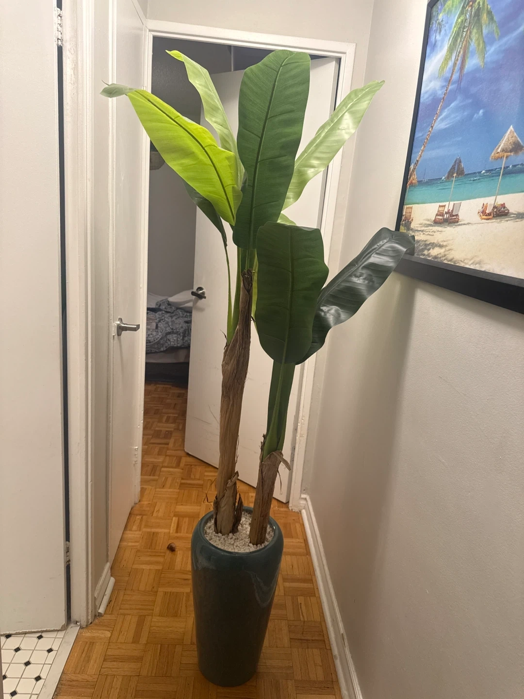 This is a tall artificial Bird of Paradise plant. It's housed in a dark green ceramic pot, which is filled with decorative white stones.