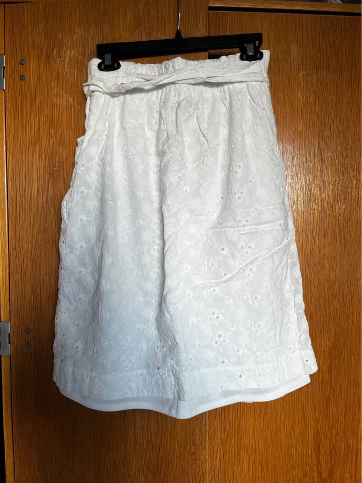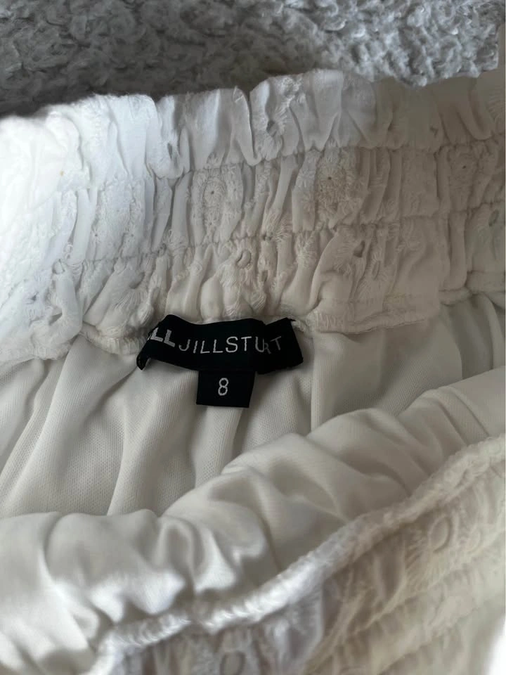 Jill Stuart white lace skirt with tie-waist. A-line silhouette with front patch pockets. Lightweight, breathable fabric. Feminine, casual design for warm weather. Size 8.