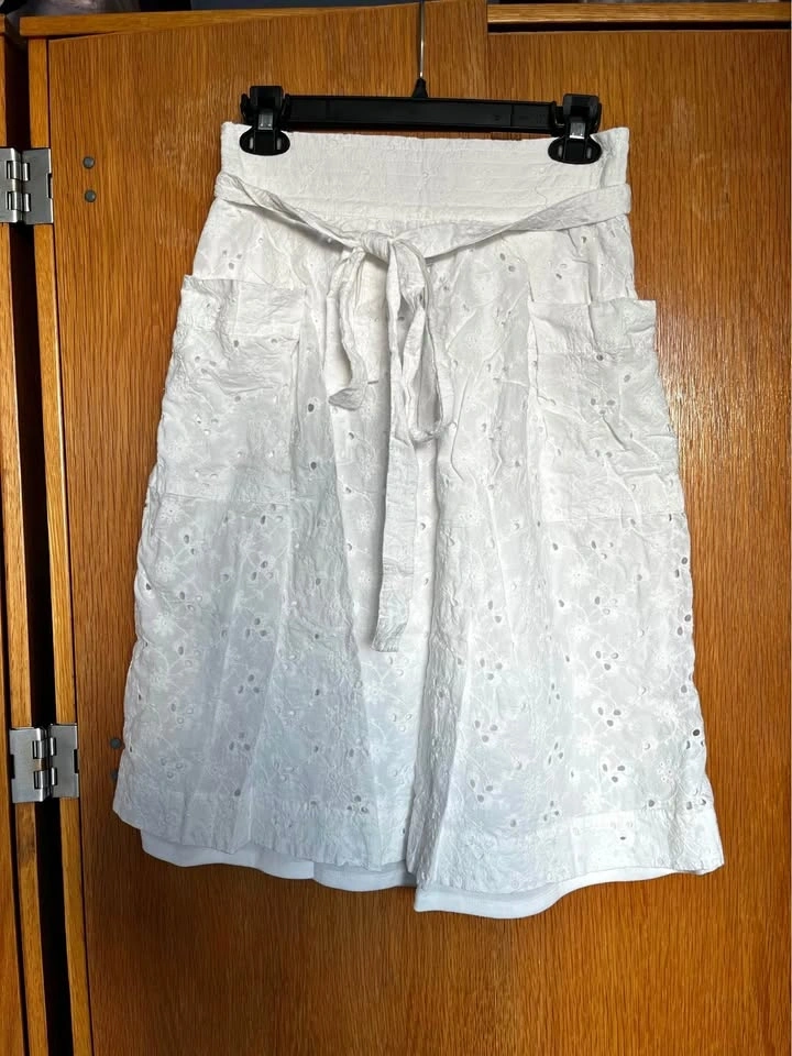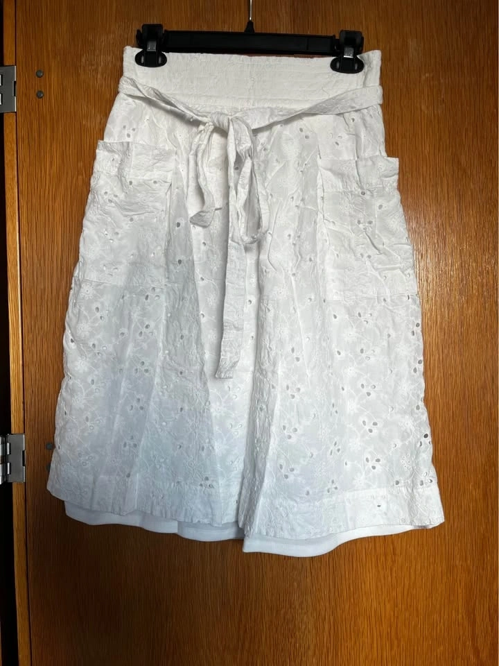 Jill Stuart white lace skirt with tie-waist. A-line silhouette with front patch pockets. Lightweight, breathable fabric. Feminine, casual design for warm weather. Size 8.