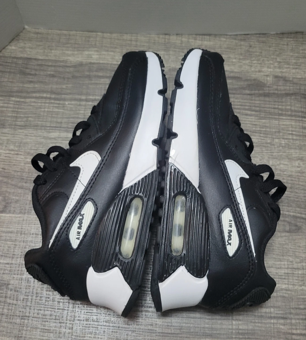 Nike Air Max 90 sneakers in black and white. US Youth size 2Y. Leather and synthetic upper. Rubber sole with Air Max cushioning.