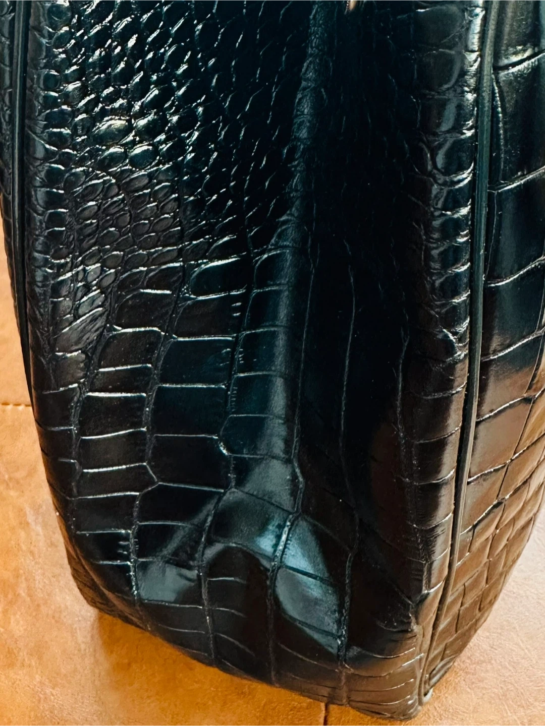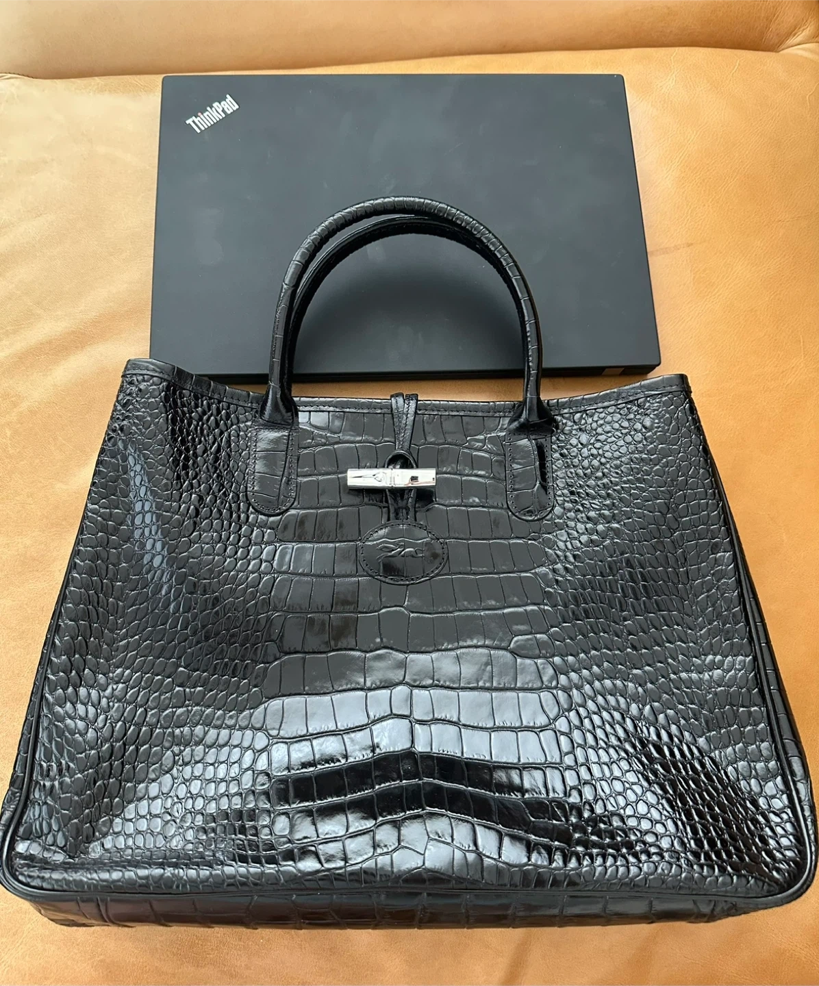 Longchamp Black Crocodile Embossed Leather Roseau Tote .This black tote bag features a sleek, embossed leather finish. It's spacious and stylish for everyday use. The bag has sturdy handles and a secure closure.