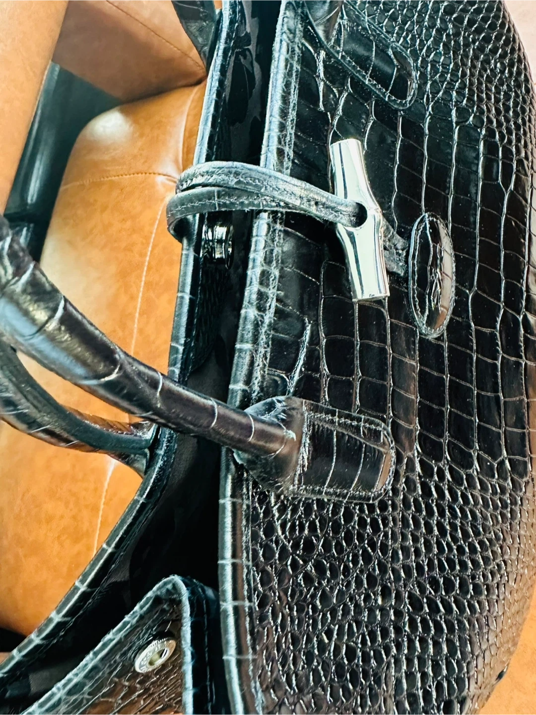 Longchamp Black Crocodile Embossed Leather Roseau Tote $260