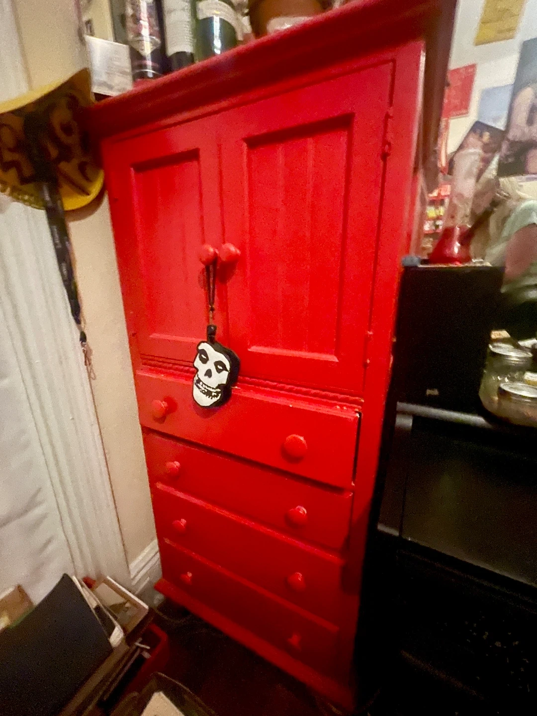 This is a bright red tall cabinet with double doors at the top and five drawers below. It's a unique piece that could add a pop of color to any room! The drawers offer ample storage space. Great for toddler room