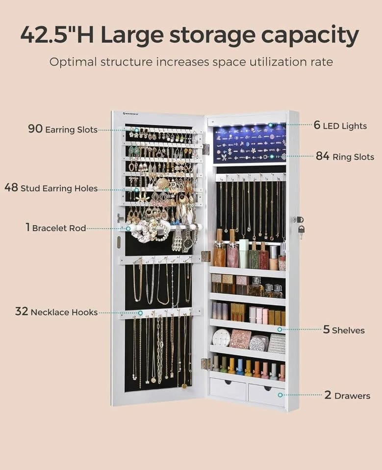 [Wall or Door-Mounted] You can mount the jewelry organizer on the wall with the provided screws or hang this jewelry cabinet over the door using the brackets included—you’ll save your precious floor space either way