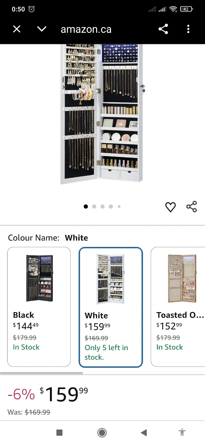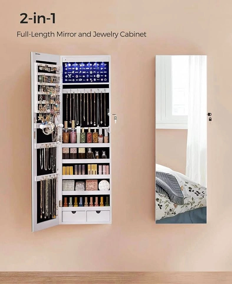 Full length mirror and wall- or door-mounted jewelry cabinet with LED interior lights. Saves space and keeps all jewelry organized and protected.