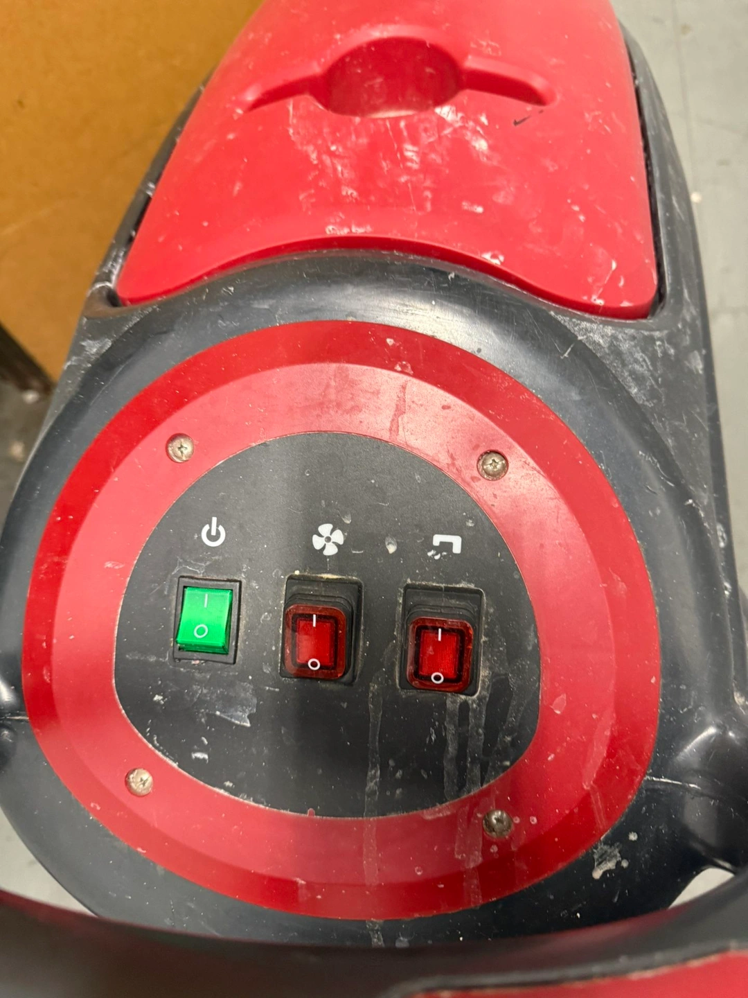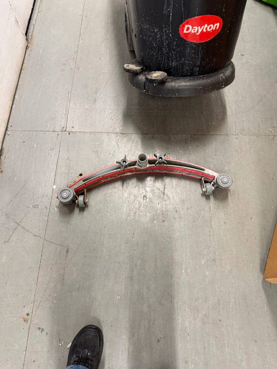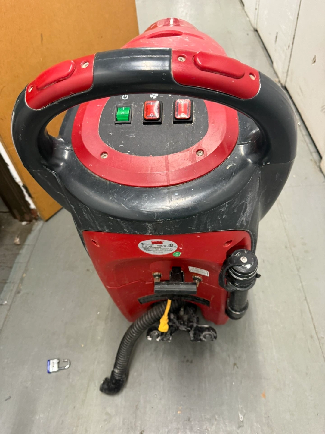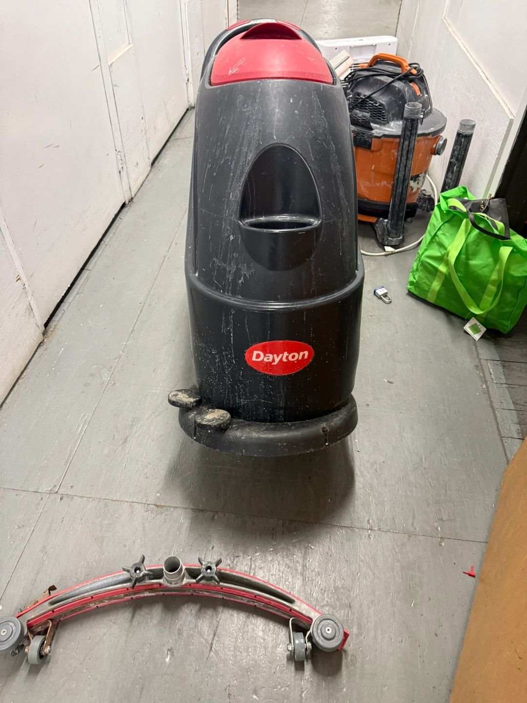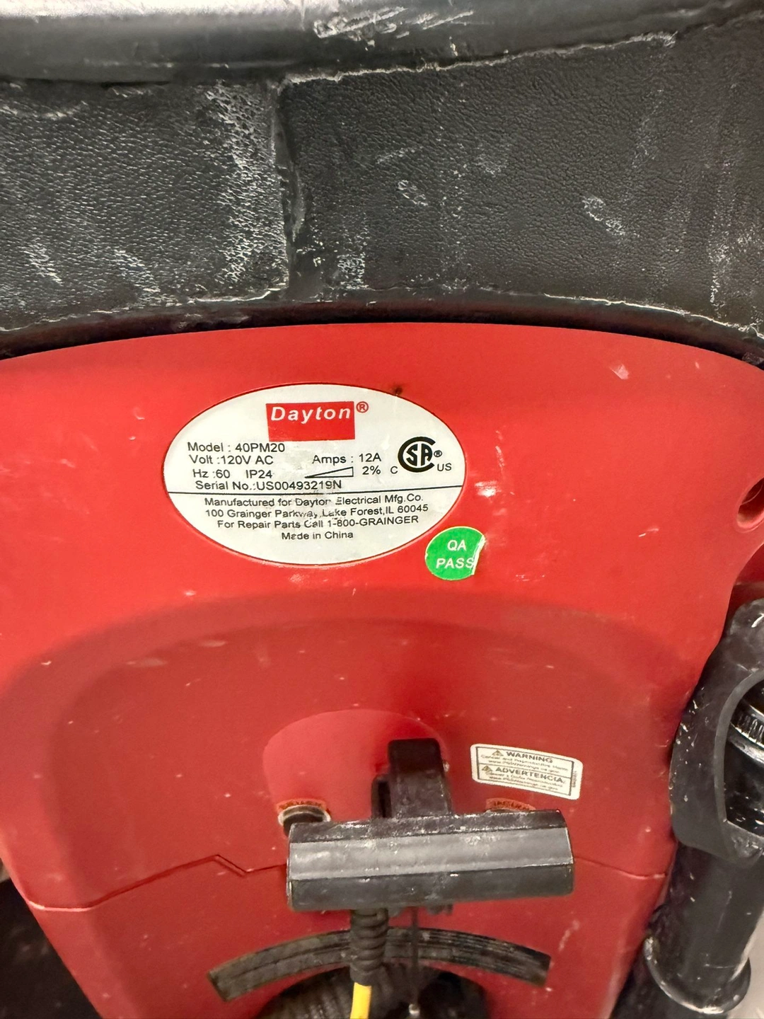Dayton Floor Scrubber. Walk-behind style with a 17-inch cleaning path. Features a 13-gallon solution tank and an 11-gallon recovery tank. Powered by AC (120VAC-60Hz) with a 66 ft cord. Includes squeegee assembly. Brush motor is 1 hp with a brush speed of 160 RPM and a maximum brush pressure of 66 lb. Feel free to message if you have any questions!