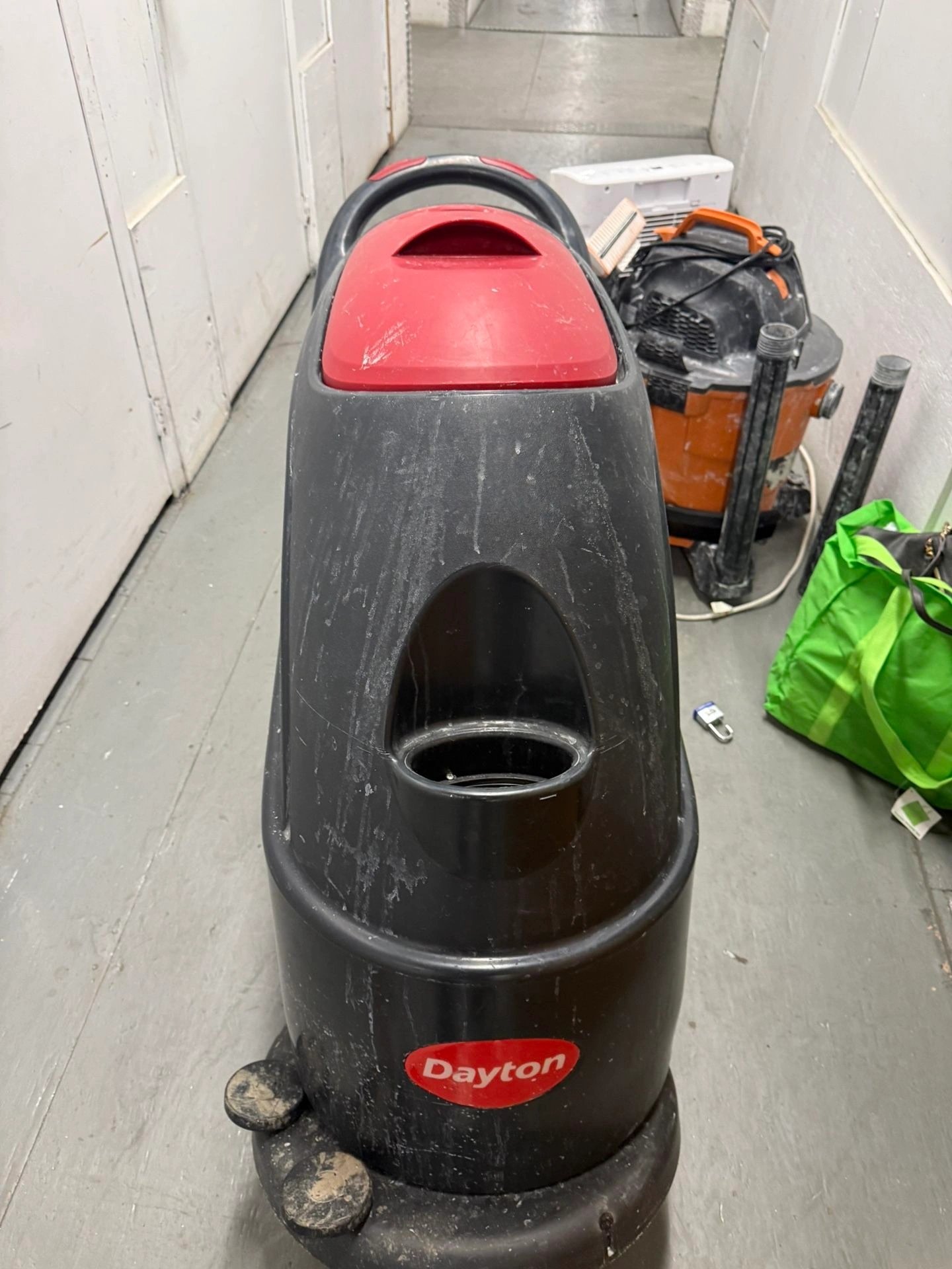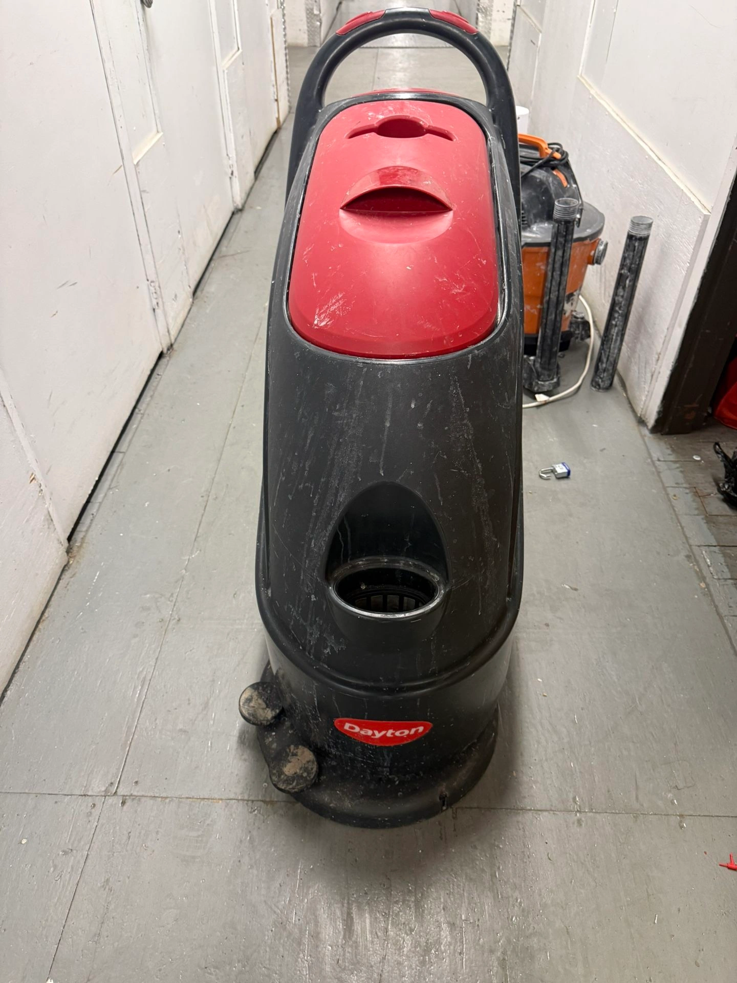 Dayton Floor Scrubber. Walk-behind style with a 17-inch cleaning path. Features a 13-gallon solution tank and an 11-gallon recovery tank. Powered by AC (120VAC-60Hz) with a 66 ft cord. Includes squeegee assembly. Brush motor is 1 hp with a brush speed of 160 RPM and a maximum brush pressure of 66 lb. Feel free to message if you have any questions!