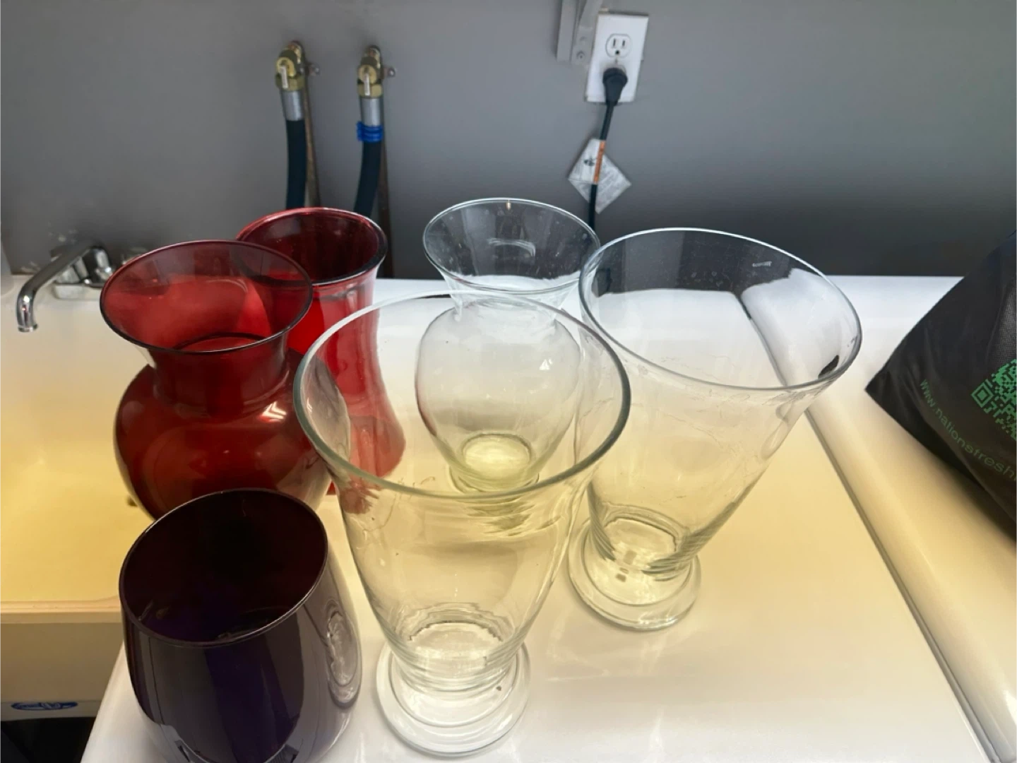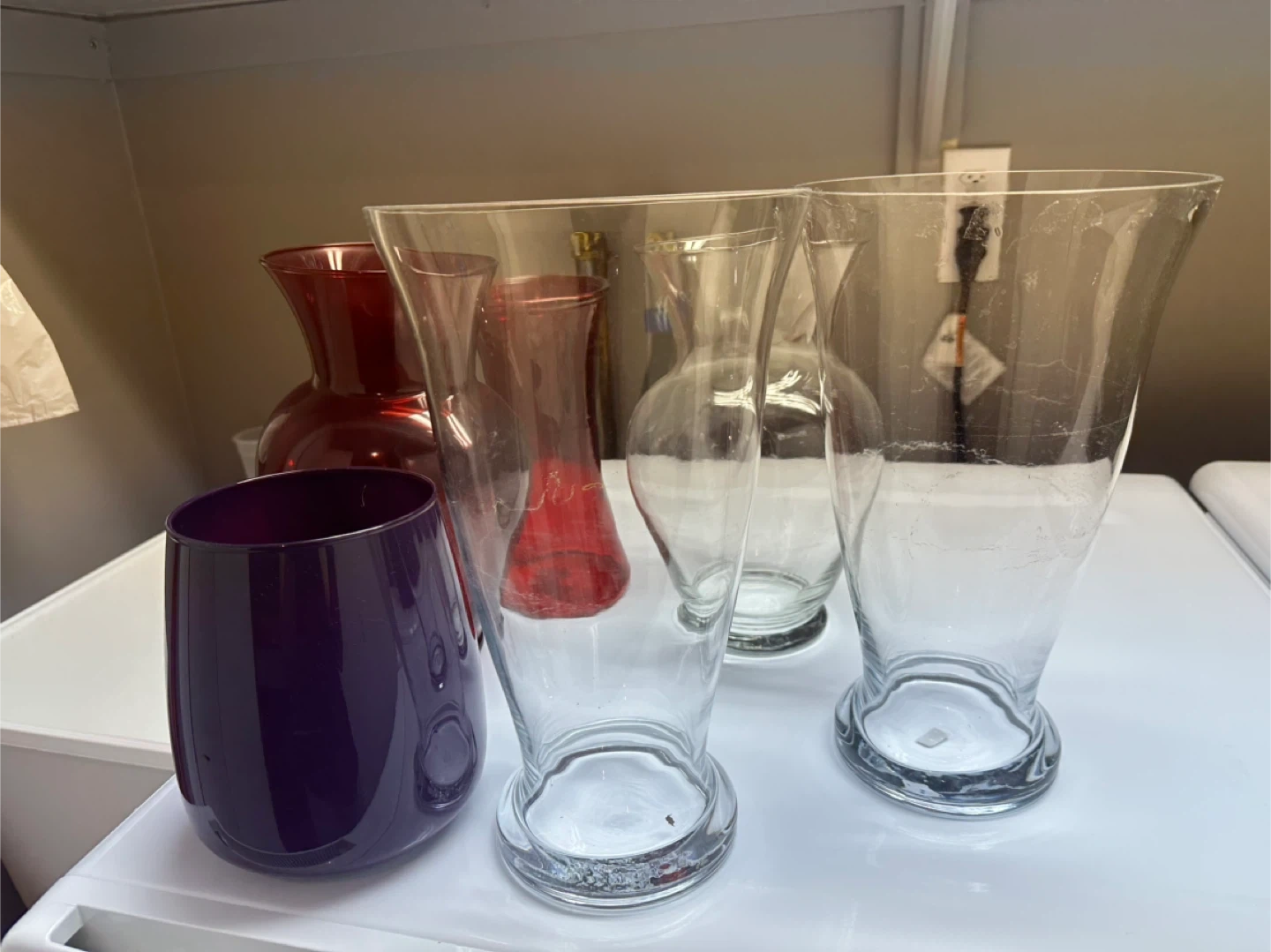 A collection of five glass vases in various styles and colours. Includes two red glass vases, one purple glass vase, and two clear glass vases. These vases are perfect for displaying fresh or artificial flowers.