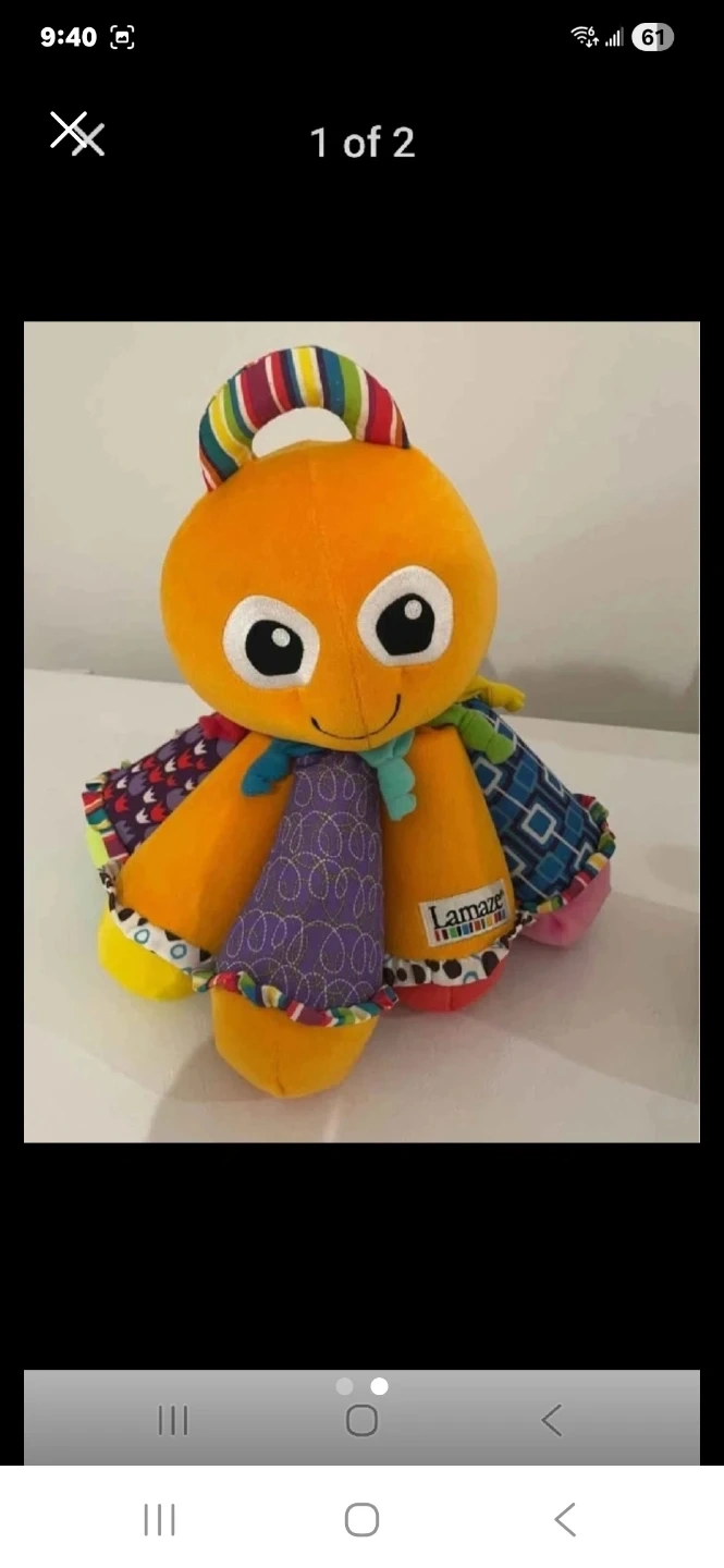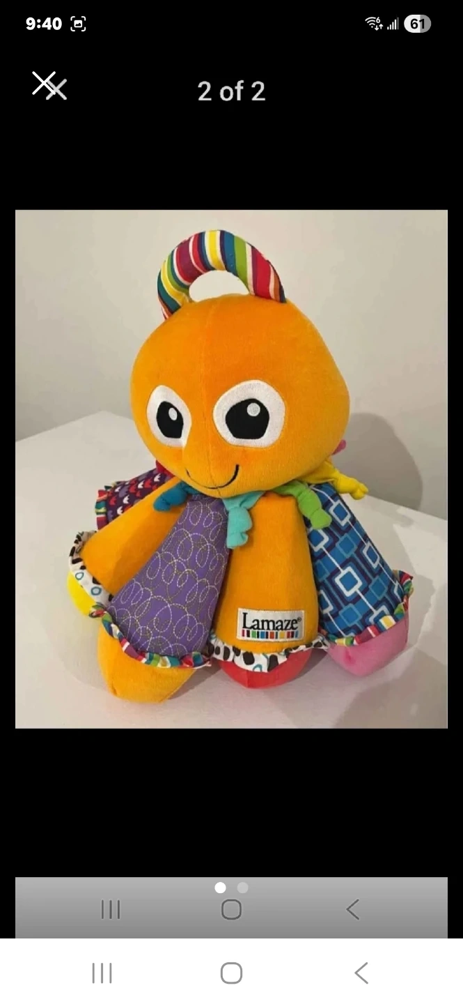 This Lamaze octopus toy features a variety of textures for sensory exploration. It has a brightly coloured rainbow ring and crinkly legs. Soft plush body and fabric tentacles.