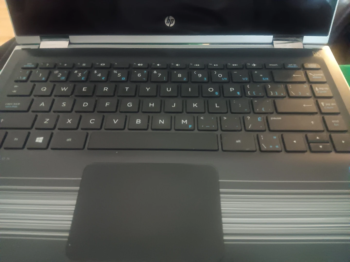 It's an HP laptop, silver in colour. The keyboard is QWERTY with European layout. It has a trackpad below the keyboard.$180 works great but needs to stay plugged in to use