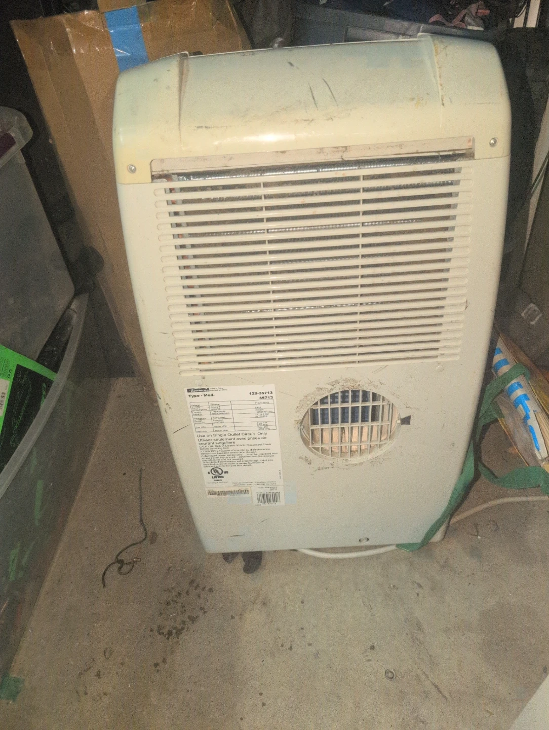 This is a Kenmore portable air conditioner, model 129-35713. It has a cooling capacity of 10000 BTU/h. It's designed for single outlet circuits. Perfect for cooling a room on a hot day!