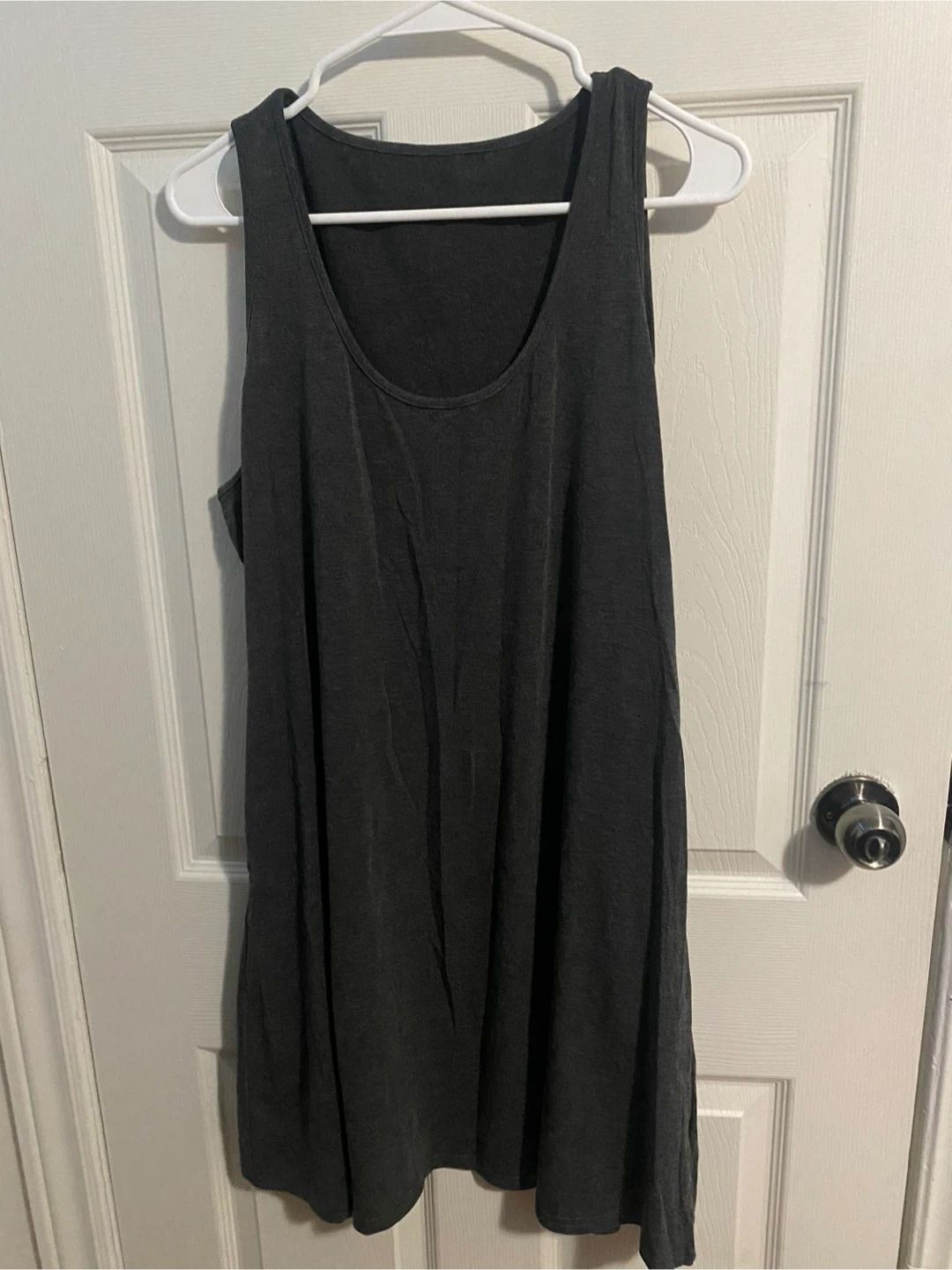 This is a dark grey sleeveless tank top dress. It's made of a soft, stretchy fabric. The hemline falls above the knee. Has pockets!