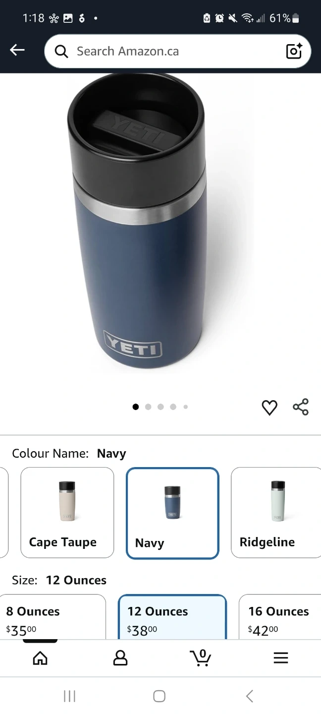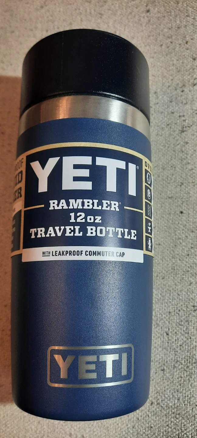 Navy Yeti Rambler 12 oz travel bottle. It comes with a leakproof commuter cap. The cap is designed to let you sip from any side without any spills.