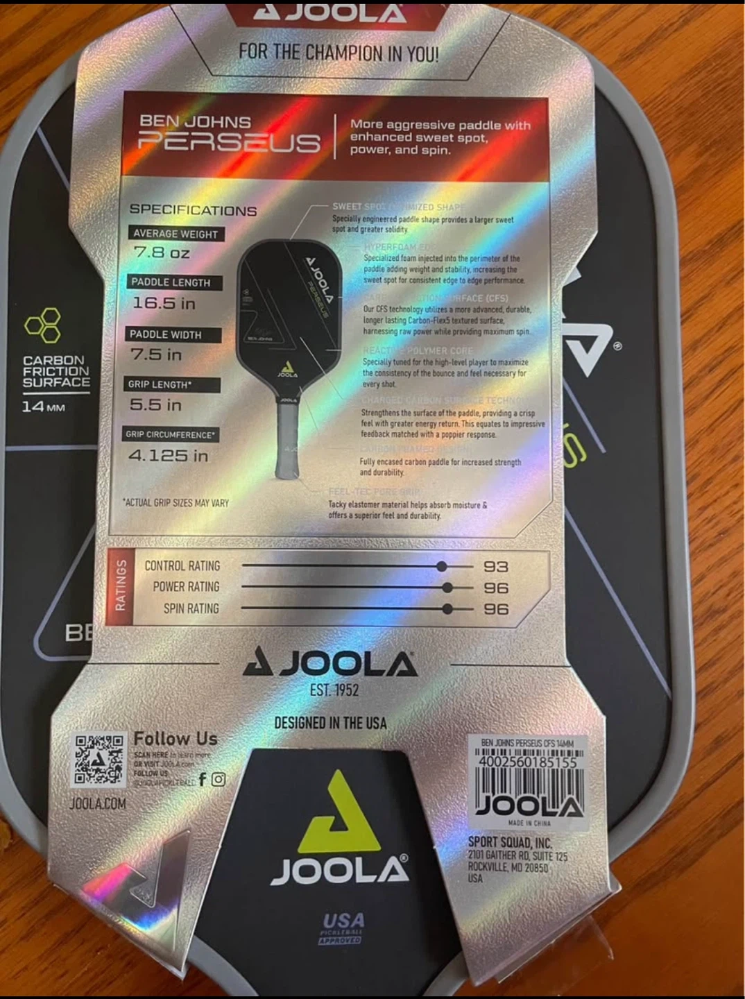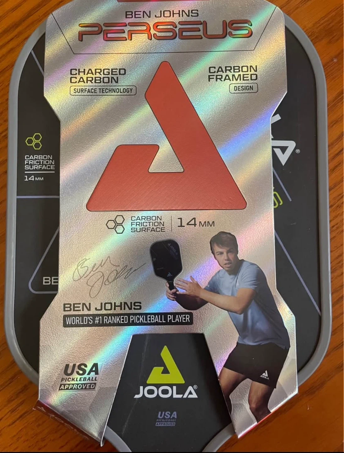 Brand new still in package. This Joola Ben Johns Perseus pickleball paddle features a 14mm thick core with carbon friction surface. It has a paddle length of 16.5 inches and a width of 7.5 inches. This paddle is designed for enhanced sweet spot and spin!