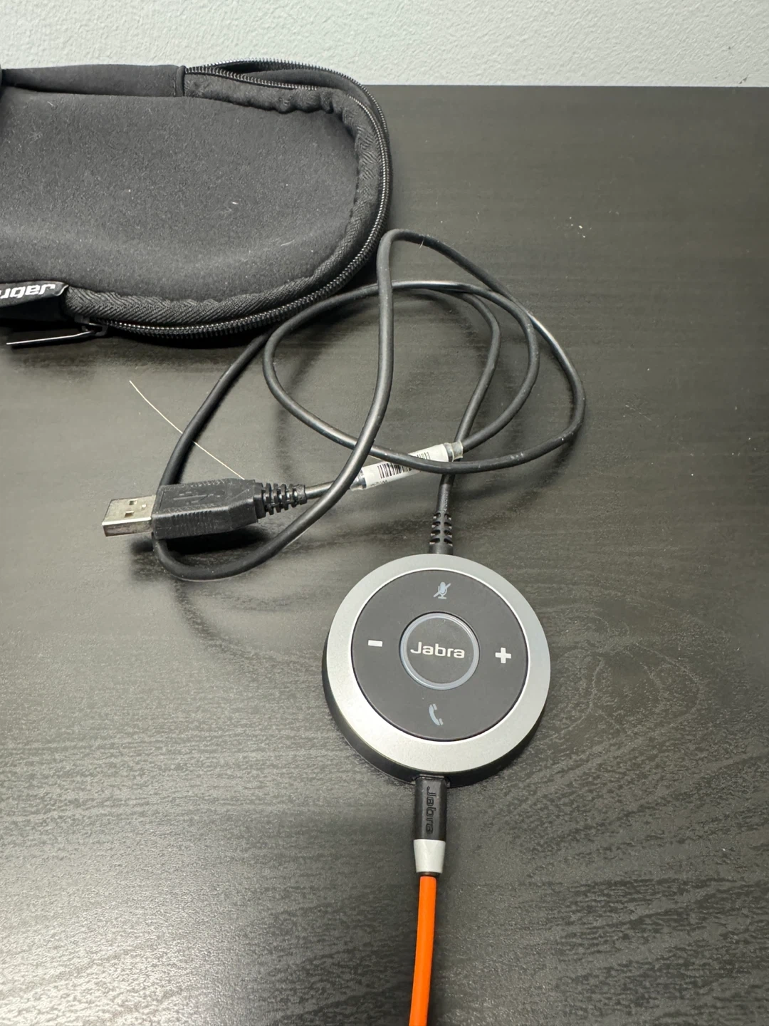 This Jabra Evolve 40headset comes with an inline control unit and a carrying case. It's designed for professional use, offering clear audio for calls and music. The headset features comfortable earcups and an adjustable microphone boom.