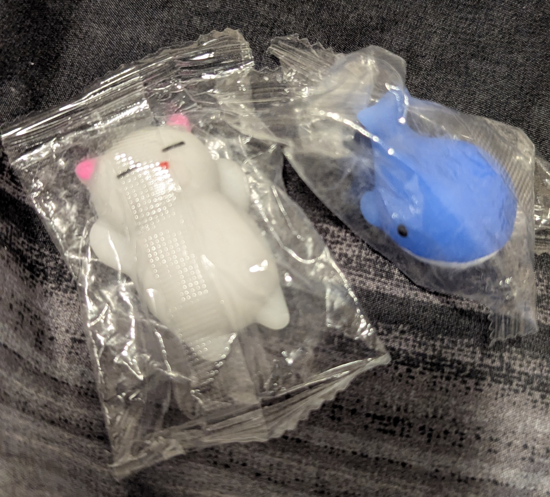 Two adorable slow rising squishies. One resembles a sleeping cat, the other a whale. Collectible and fun to squeeze.