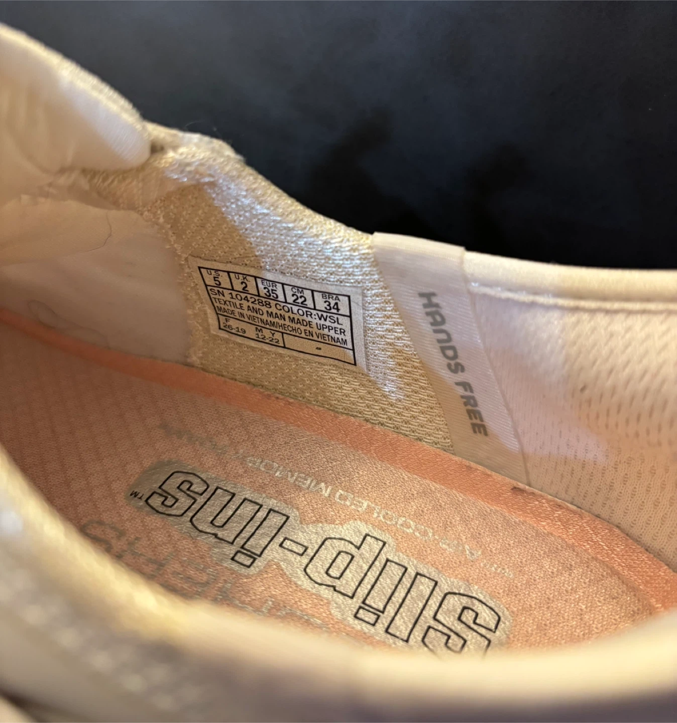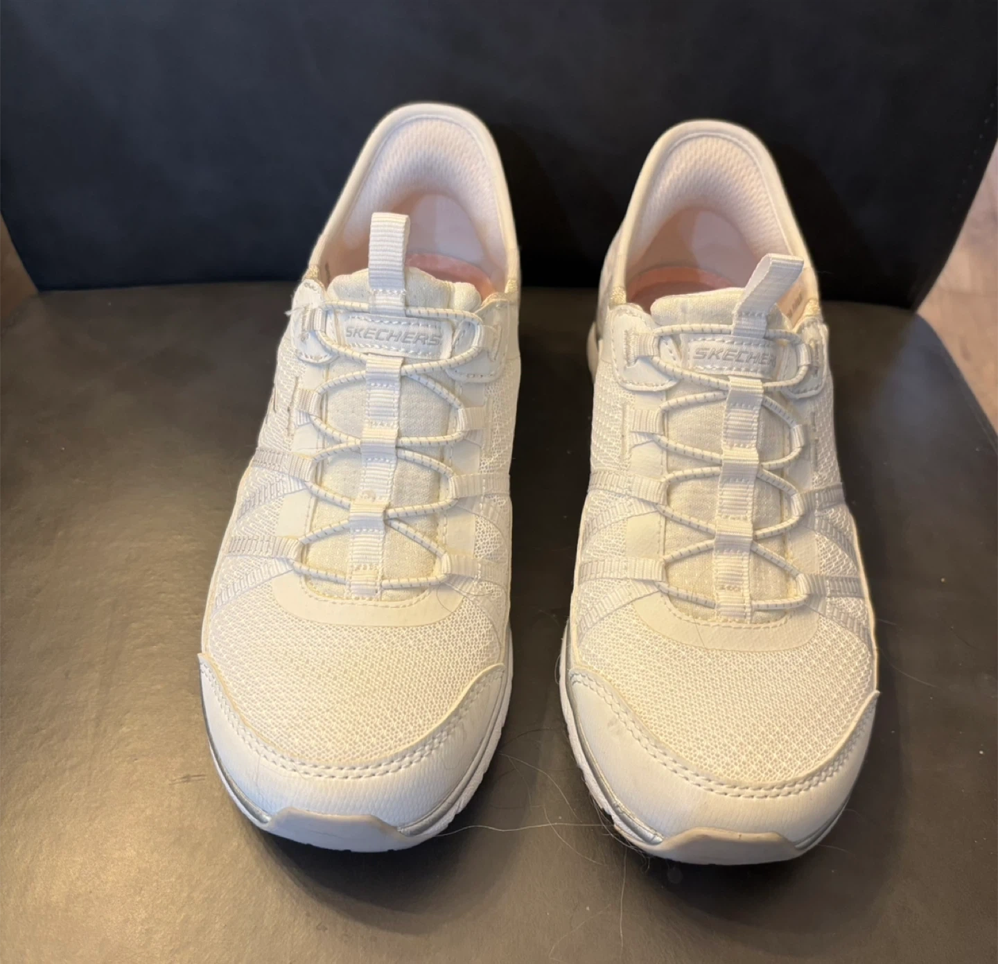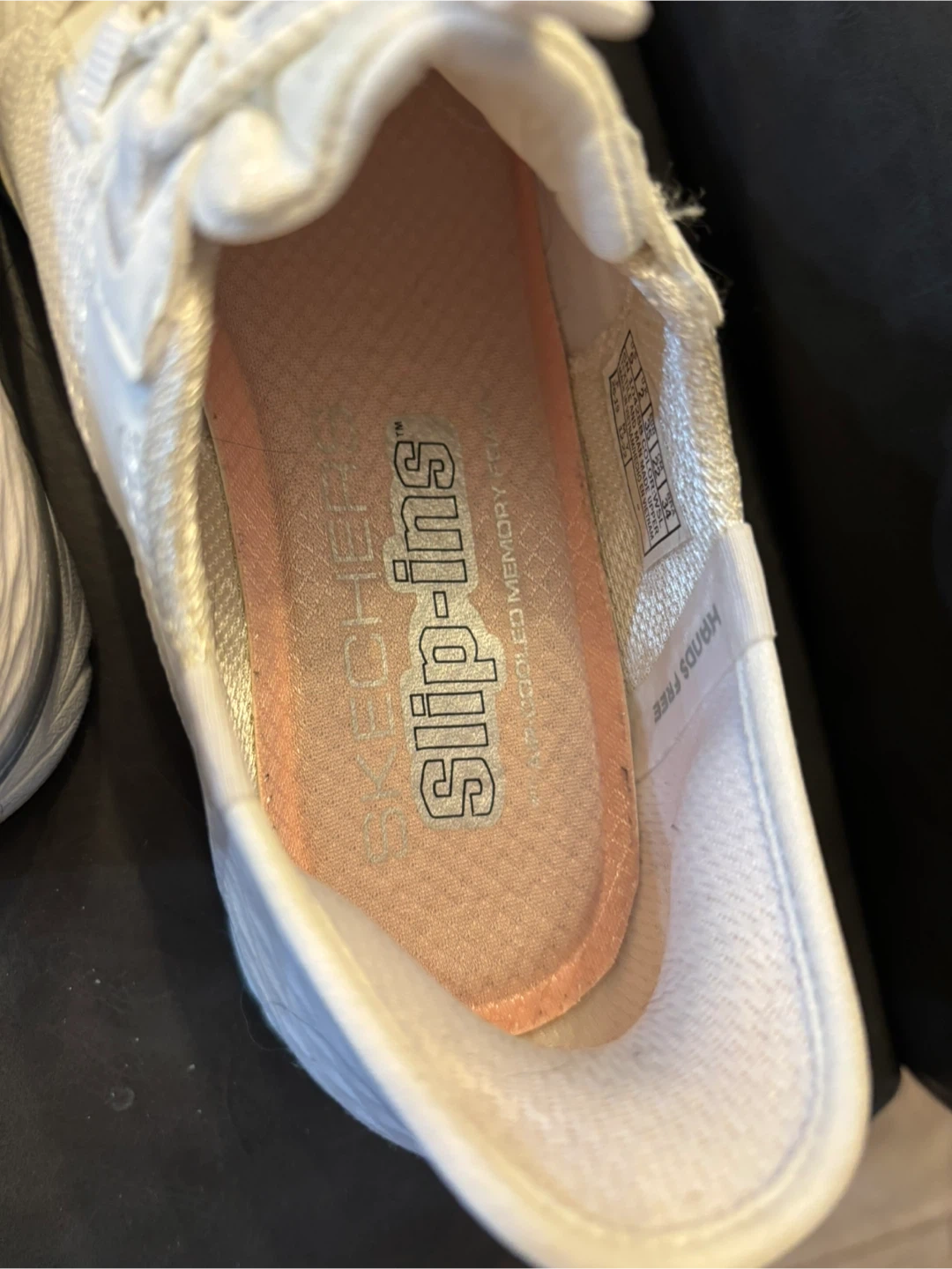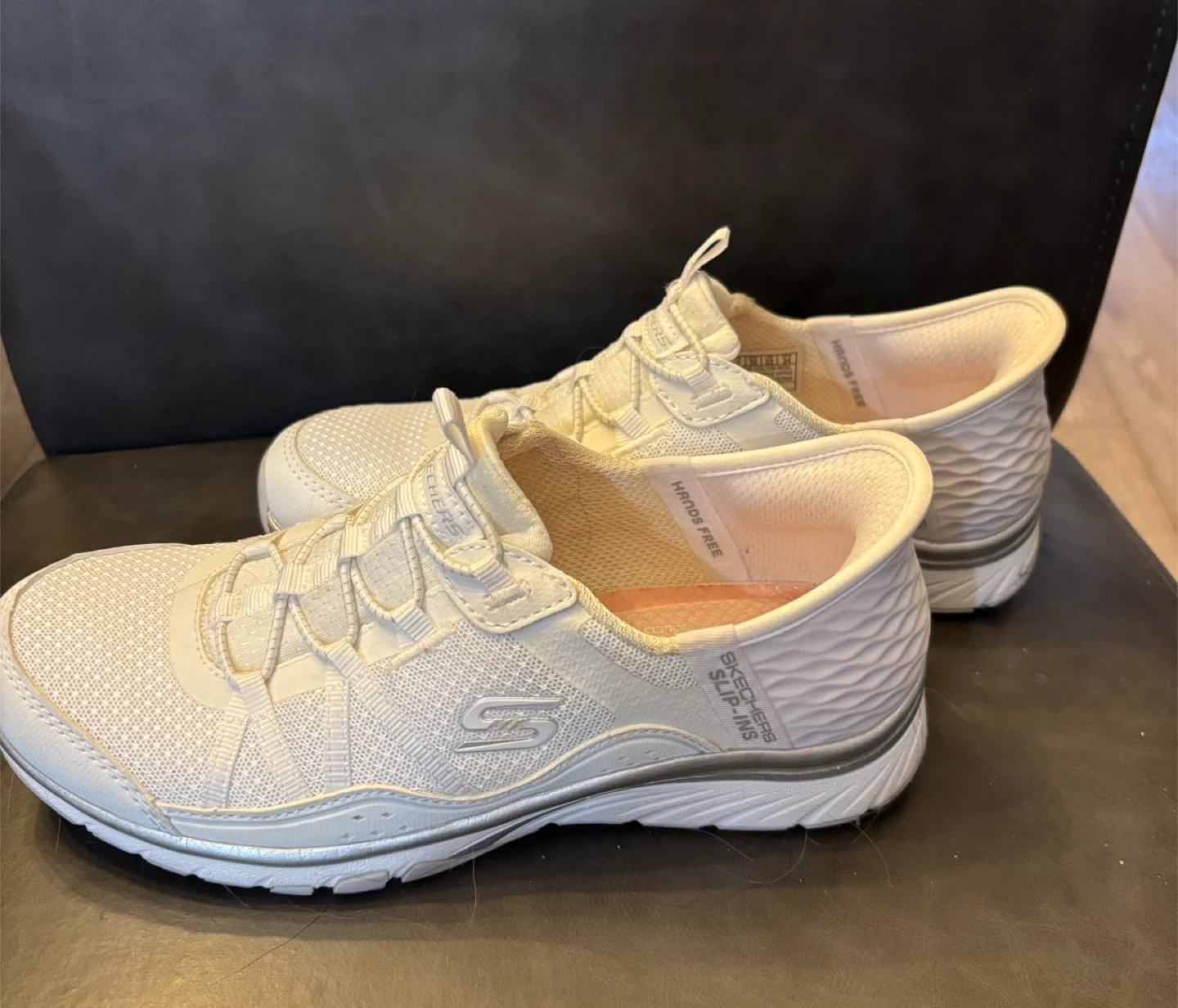 Like New. Worn indoors 2X. White Skechers Slip-ins women's sneakers. These shoes are designed for easy on and off with a slip-in fit. They feature a breathable textile upper and a cushioned insole for comfort. Size is US 5, EUR 35.
