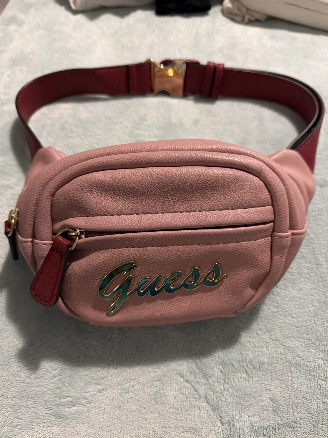 This is a stylish pink fanny pack from Guess. It features a faux leather exterior with the signature Guess logo in gold. The adjustable belt strap has a gold buckle closure. It's perfect for carrying essentials hands-free!