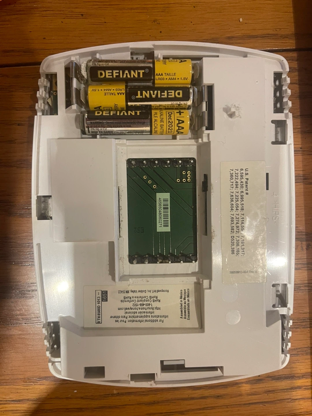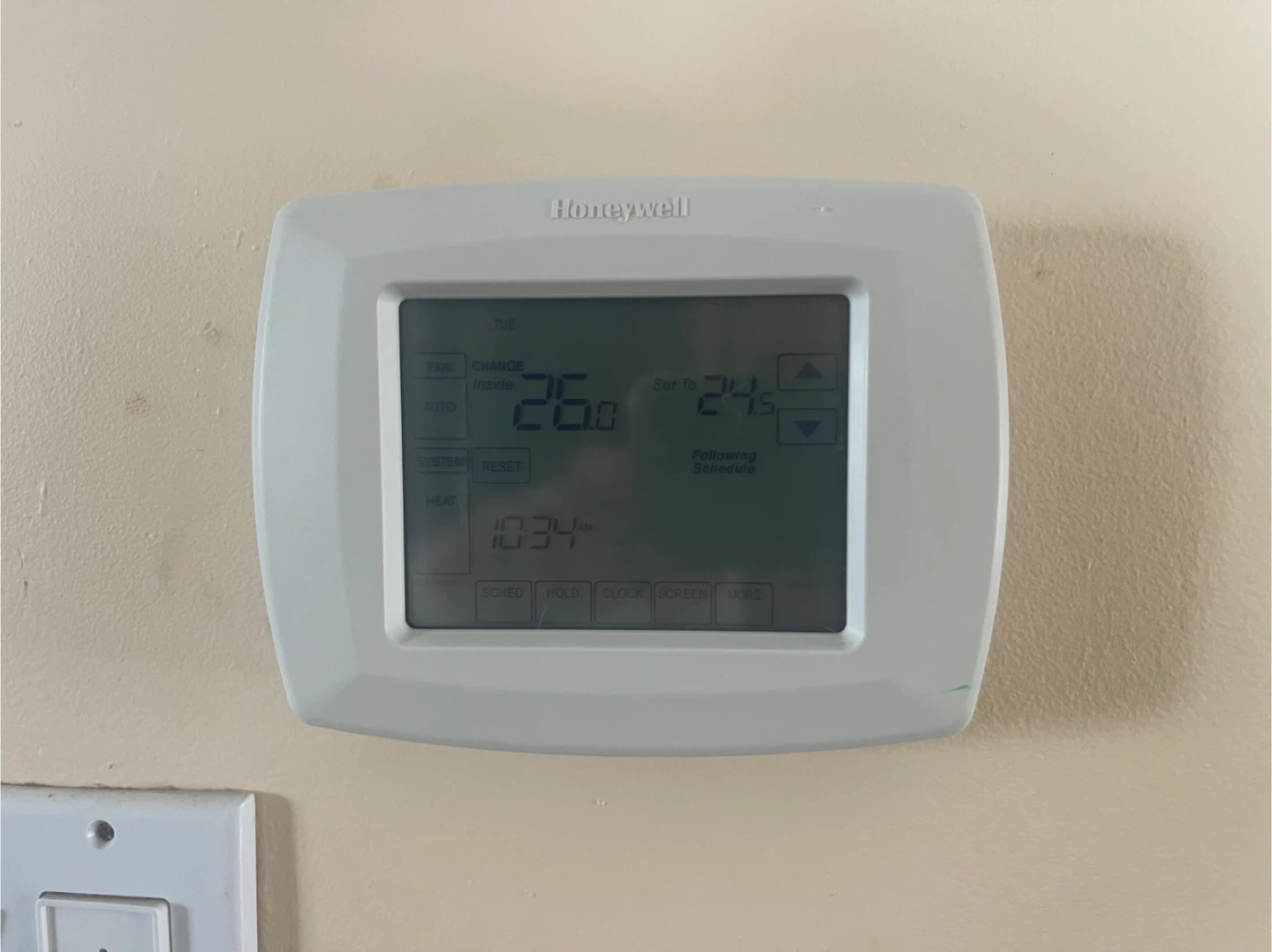 This is a Honeywell Vision Pro 8500 digital thermostat. It has a bright green display and programmable settings for heating and cooling. The thermostat runs on AAA batteries, and has a wallplate included for installation.
