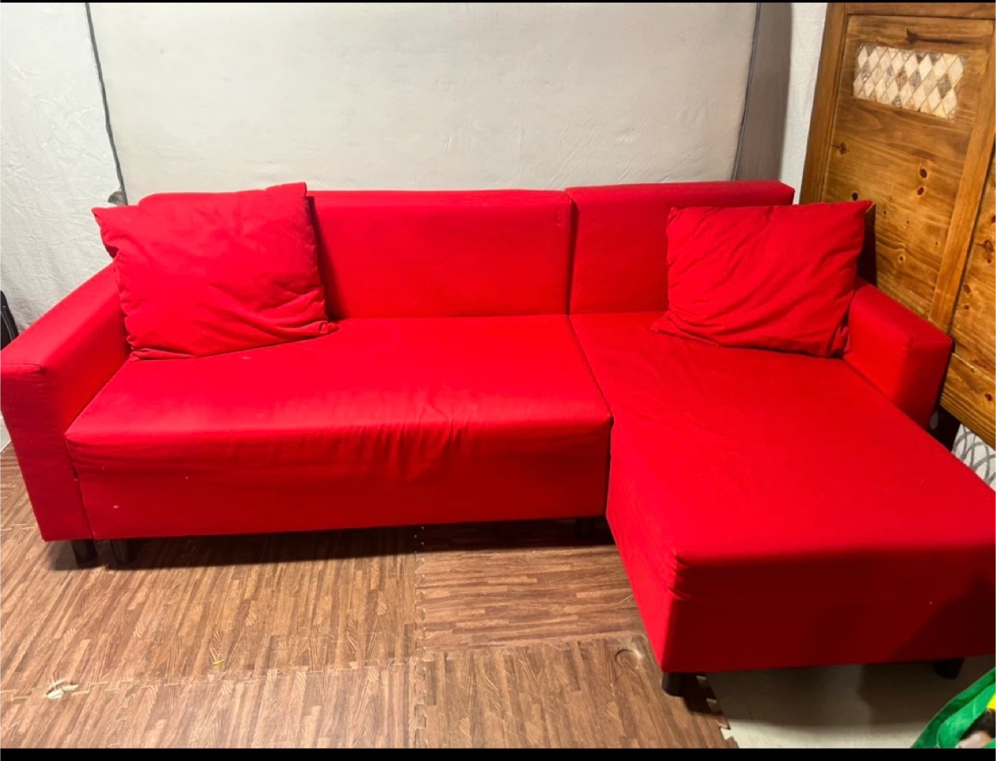 A vibrant red sectional sofa featuring a chaise lounge. Comes with two matching throw pillows. Upholstered in a durable fabric. It's a great addition to any living space!