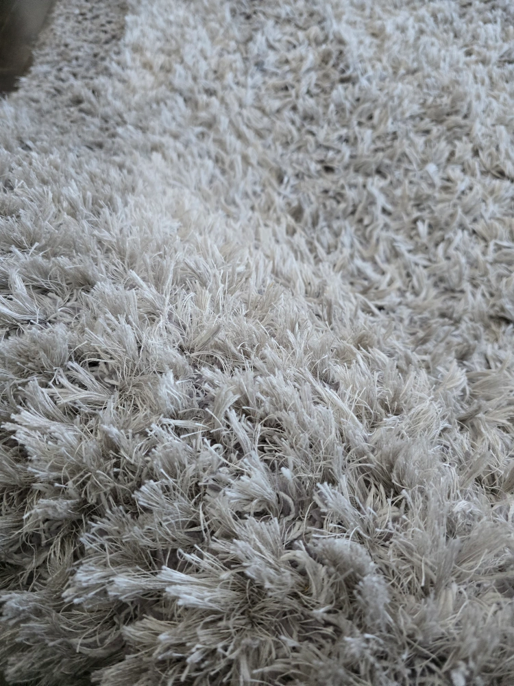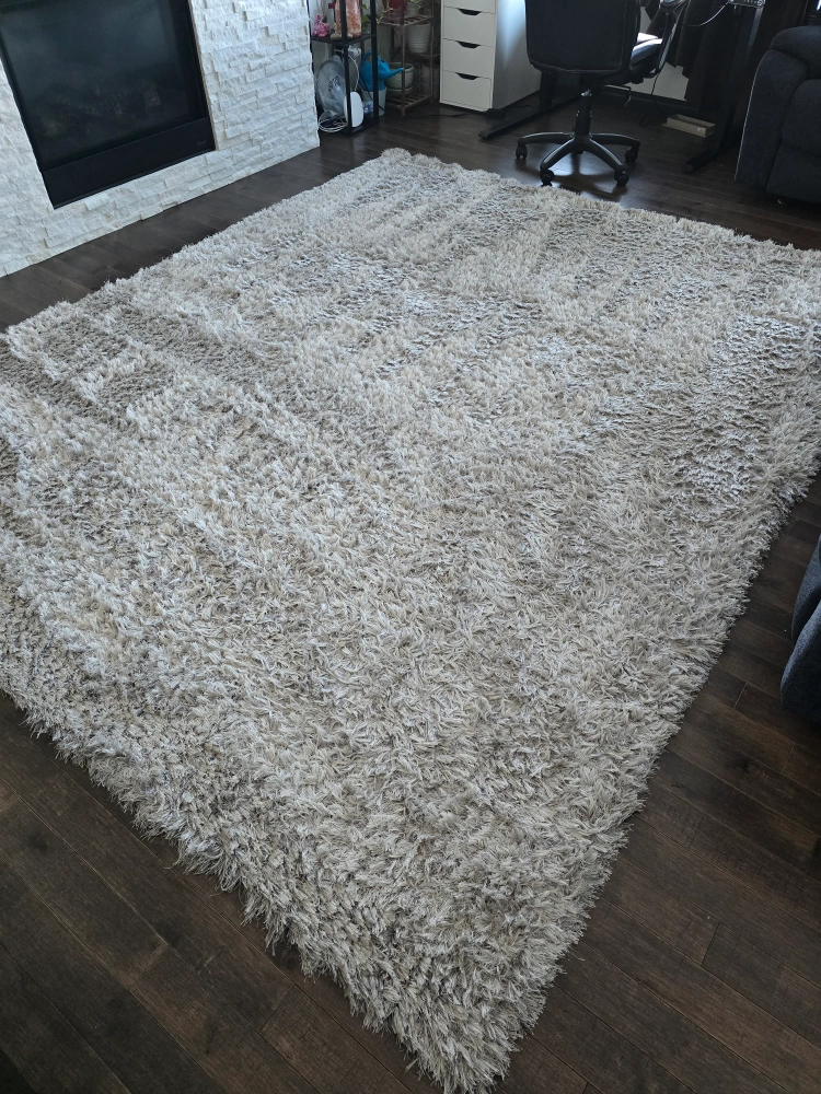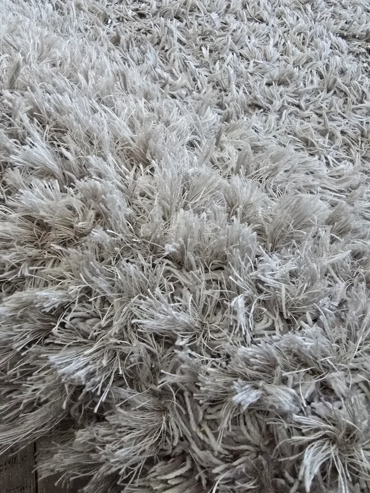 Large, fluffy grey rug. Soft and comfortable underfoot. Perfect for living room or bedroom. Good condition. Pet free and smoke free home.