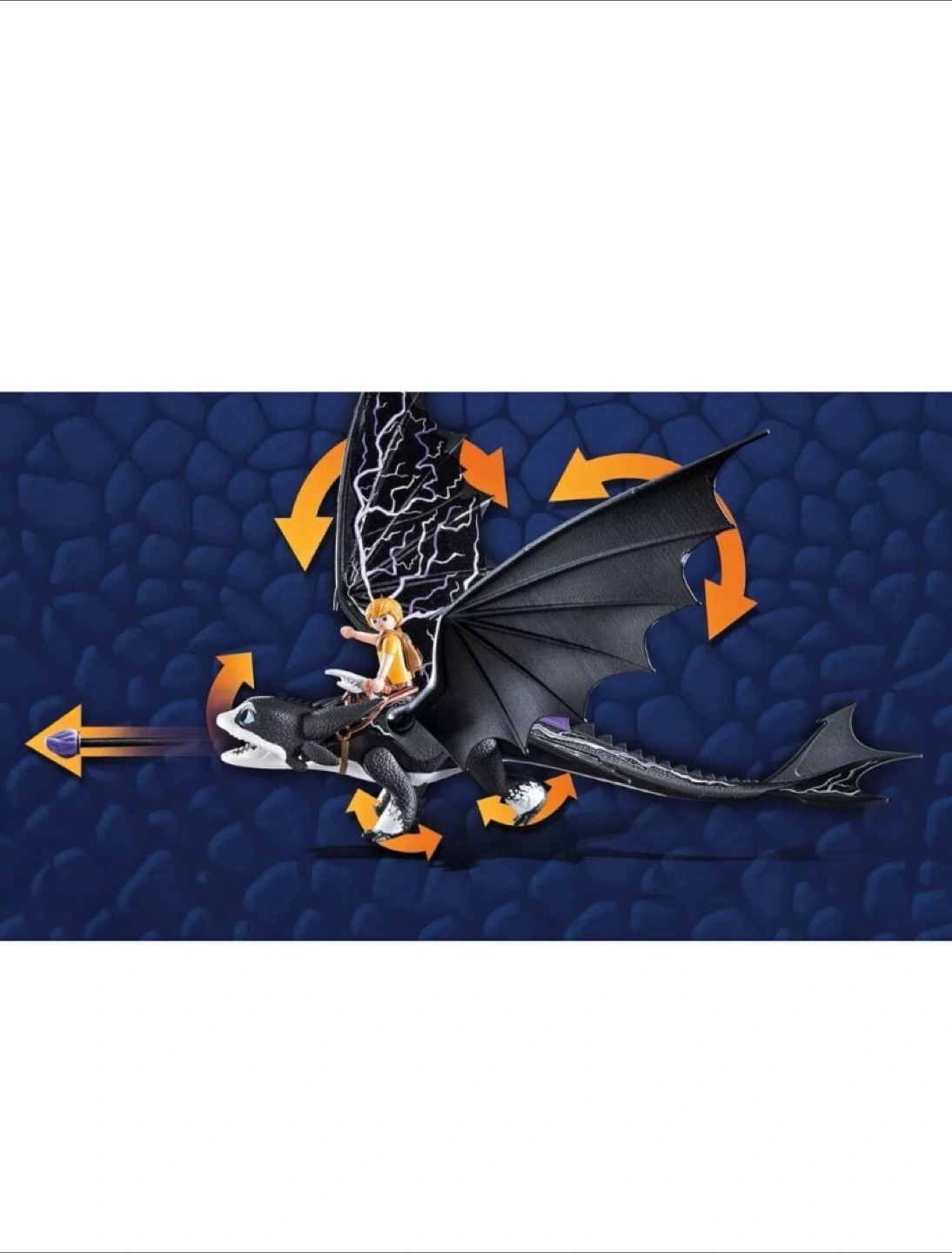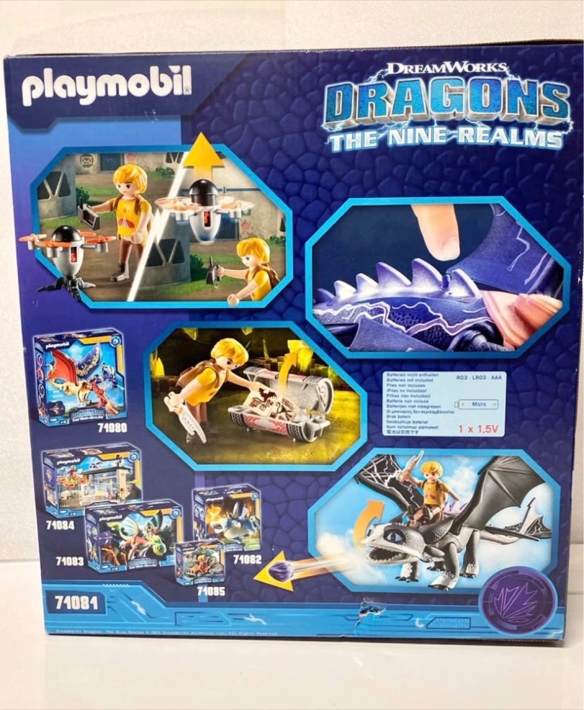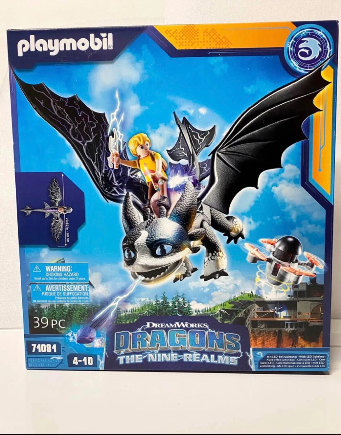 This Playmobil set features a dragon figure from Dreamworks Dragons: The Nine Realms. It includes a rider figure and various accessories. The dragon has movable wings and a projectile-launching feature.