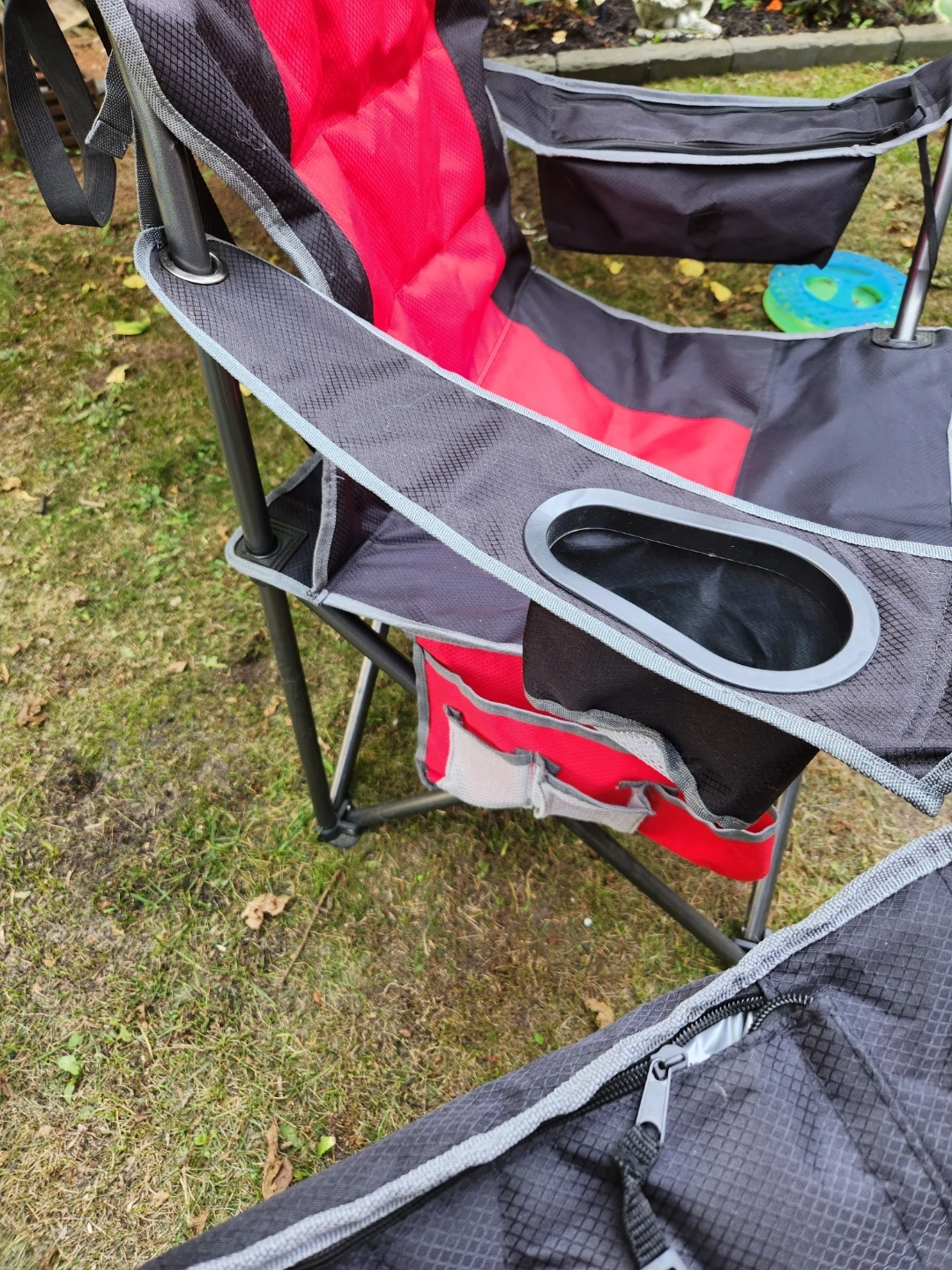 Used once. Heavy-duty lawn chairs. Comes with bag for carrying. Has a mini cooler in the arm rest.