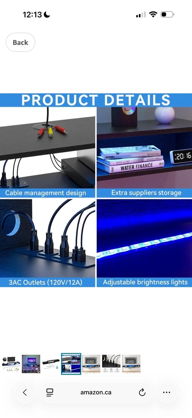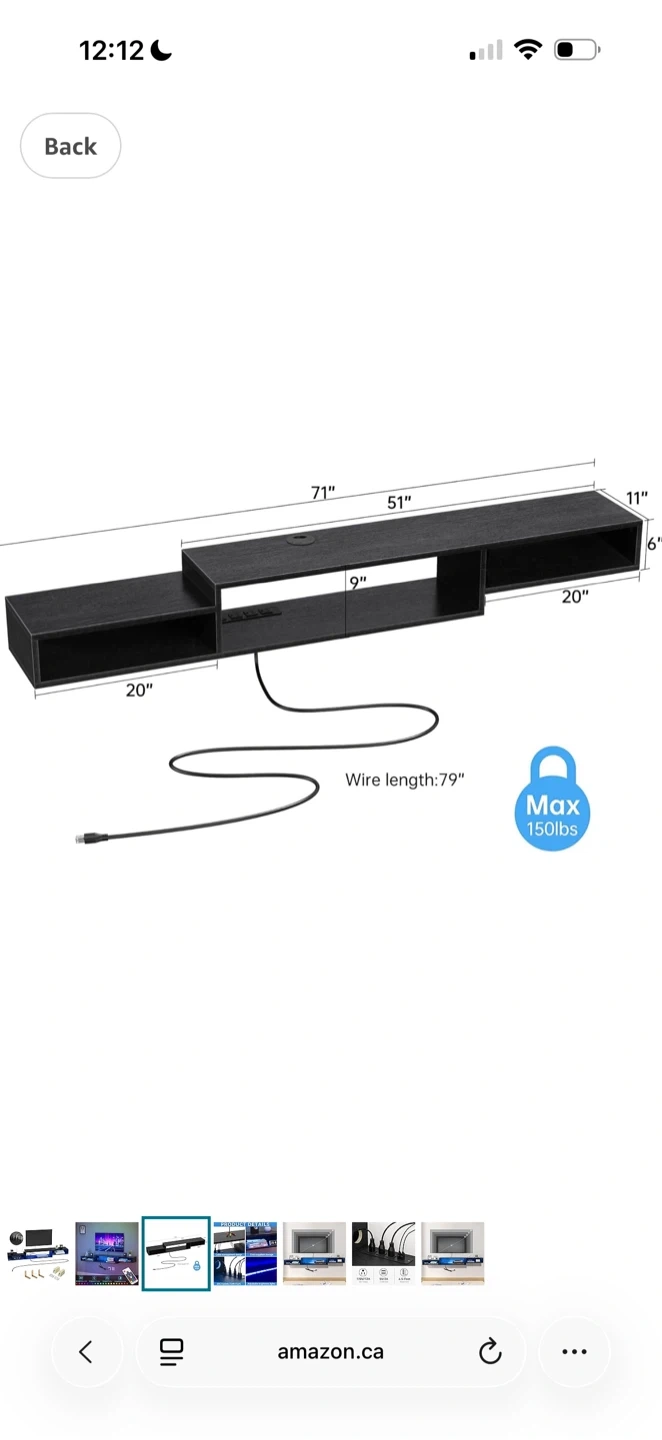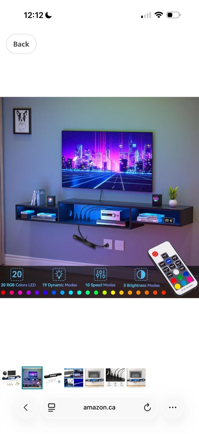 This sleek, floating media console offers a clean look with built-in cable management. It comes with 20 RGB LED colors and 19 dynamic modes for customizable ambiance. The unit supports up to 150lbs and features 3 AC outlets.