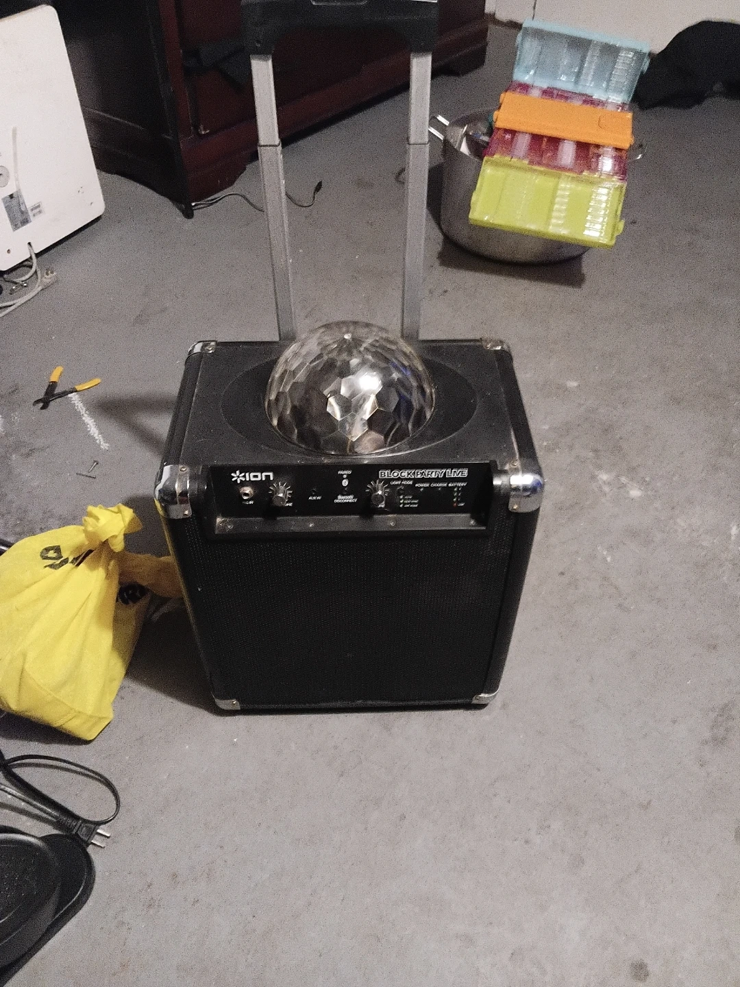 ION Block Party Live portable speaker with built-in disco ball light. It's a black, rechargeable unit with wheels and a retractable handle. Includes power cord.