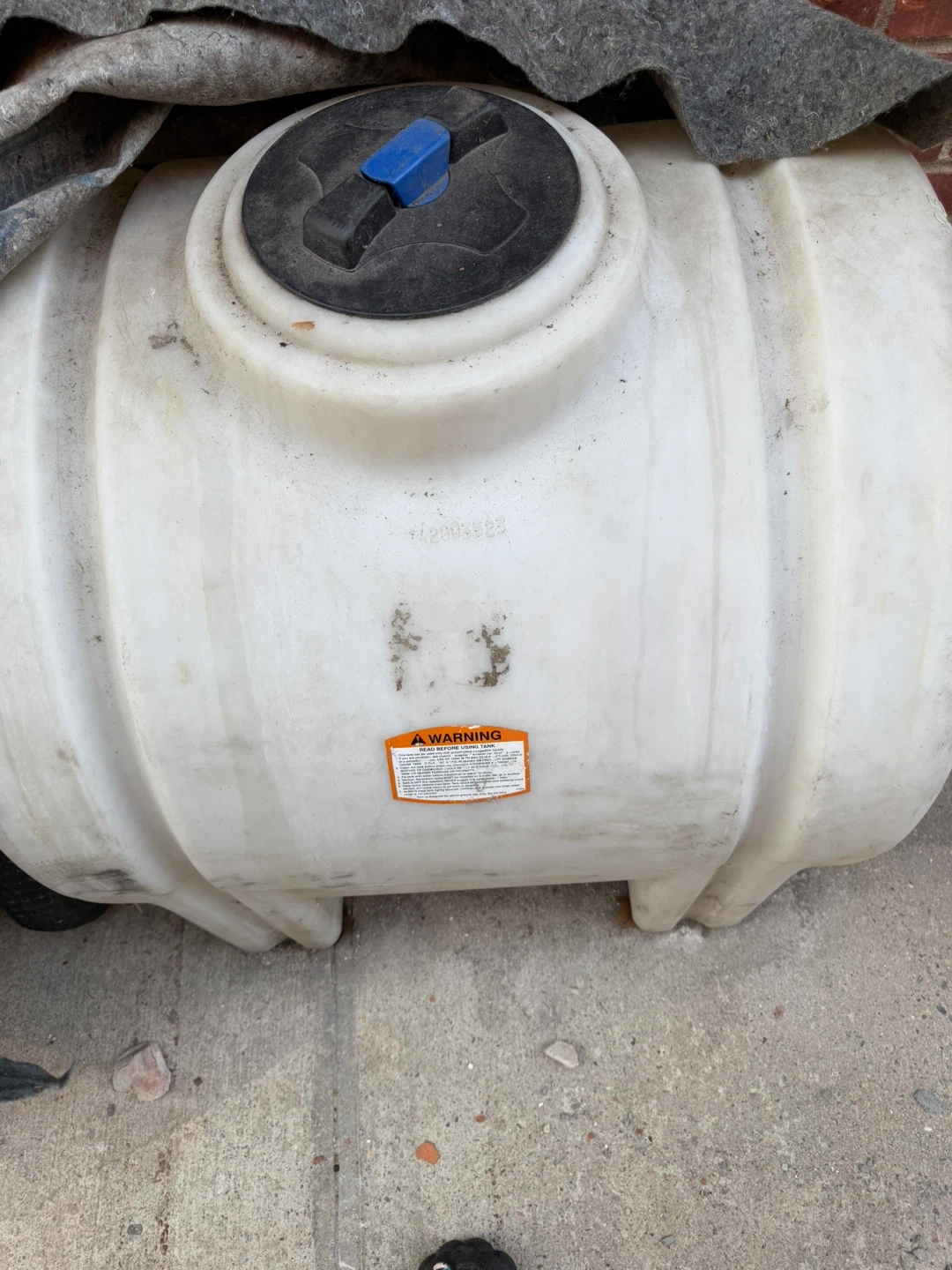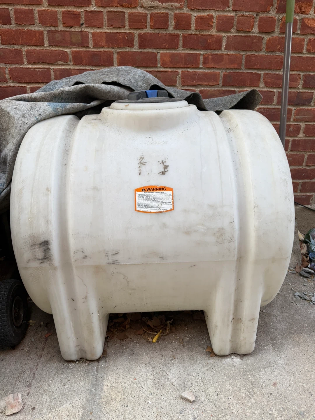 This is a white plastic water storage tank with a black lid and blue cap. It has a durable plastic construction. Great for storing water for gardening, detailing or emergency use. The water tank can hold up to 225 Gallons of water.