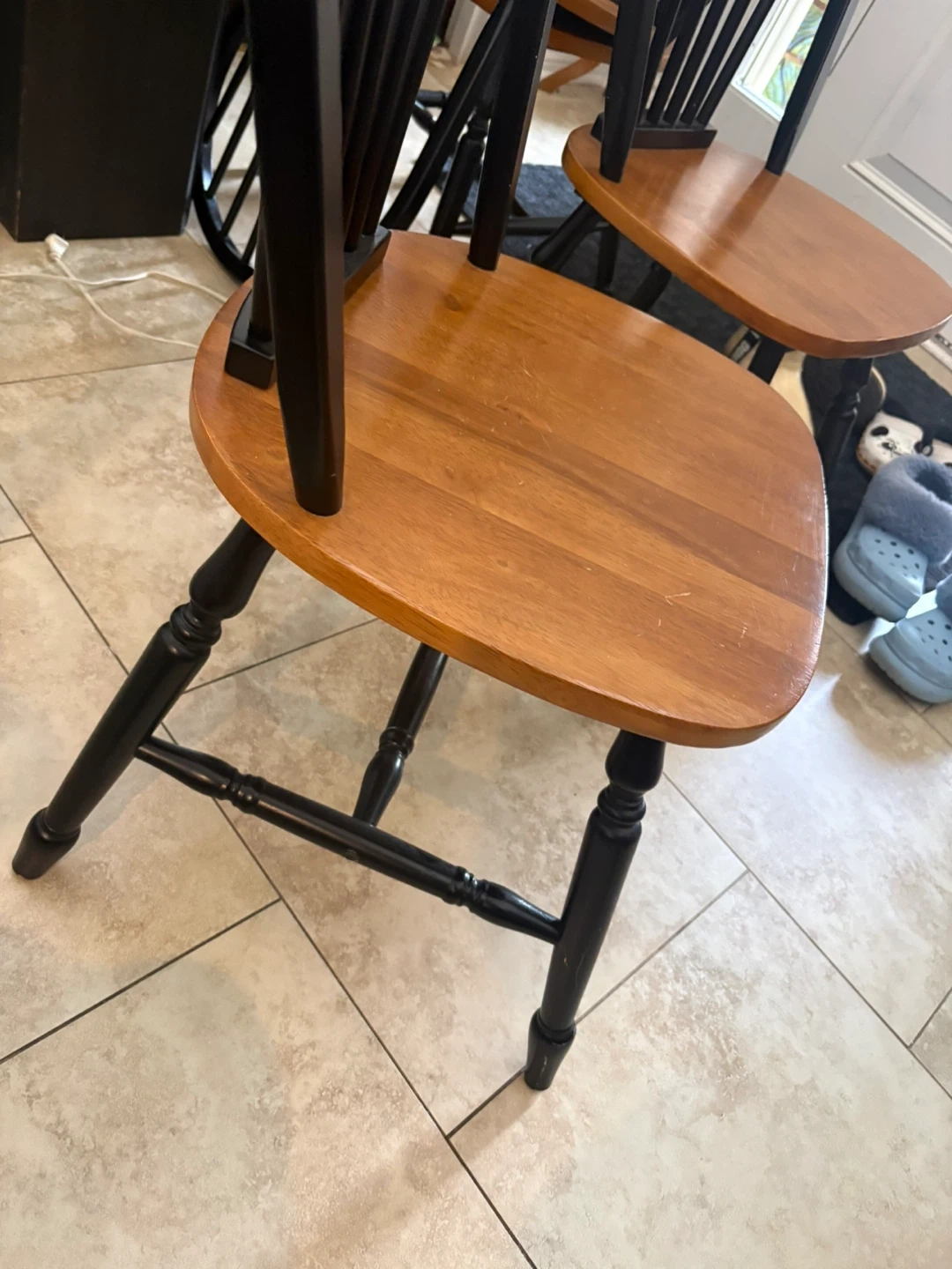 Set of four wooden dining chairs with a black frame and natural wood seats. These chairs feature a classic Windsor design, perfect for any kitchen or dining area. They're made with durable wood construction.