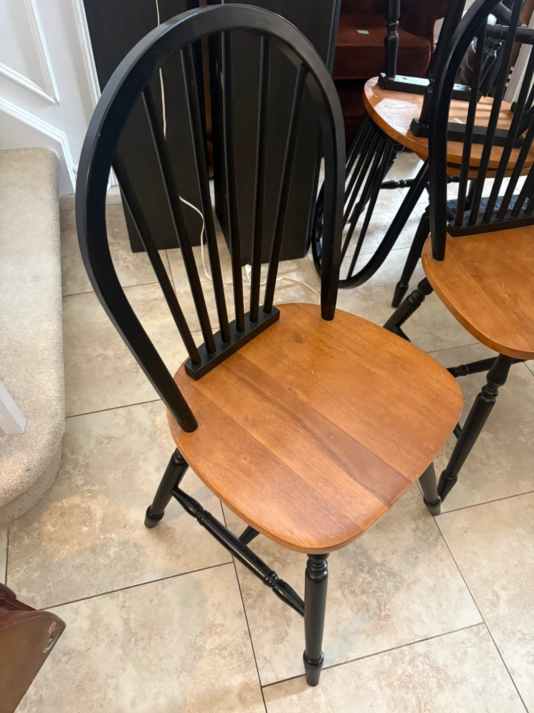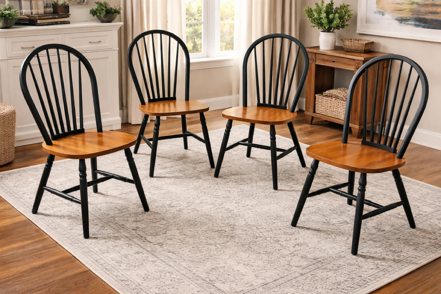 Set of four wooden dining chairs with a black frame and natural wood seats. These chairs feature a classic Windsor design, perfect for any kitchen or dining area. They're made with durable wood construction.