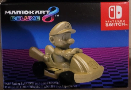 Gold Mario figure from Mario Kart 8 Deluxe. Figure comes in a small box with a Nintendo Switch logo.