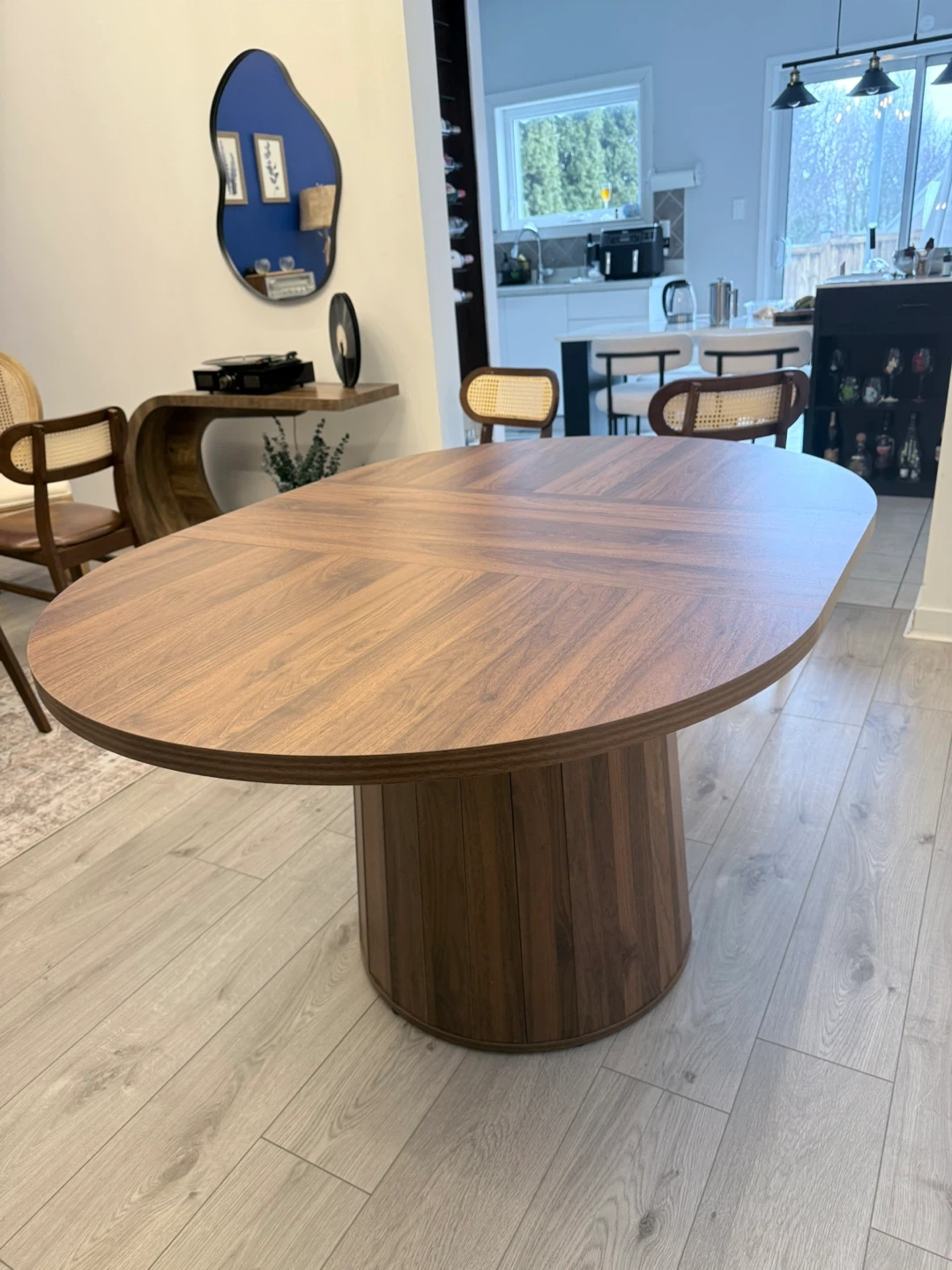 Oval pedestal dining table with a warm walnut finish. In perfect condition in non smoking and no pet home .