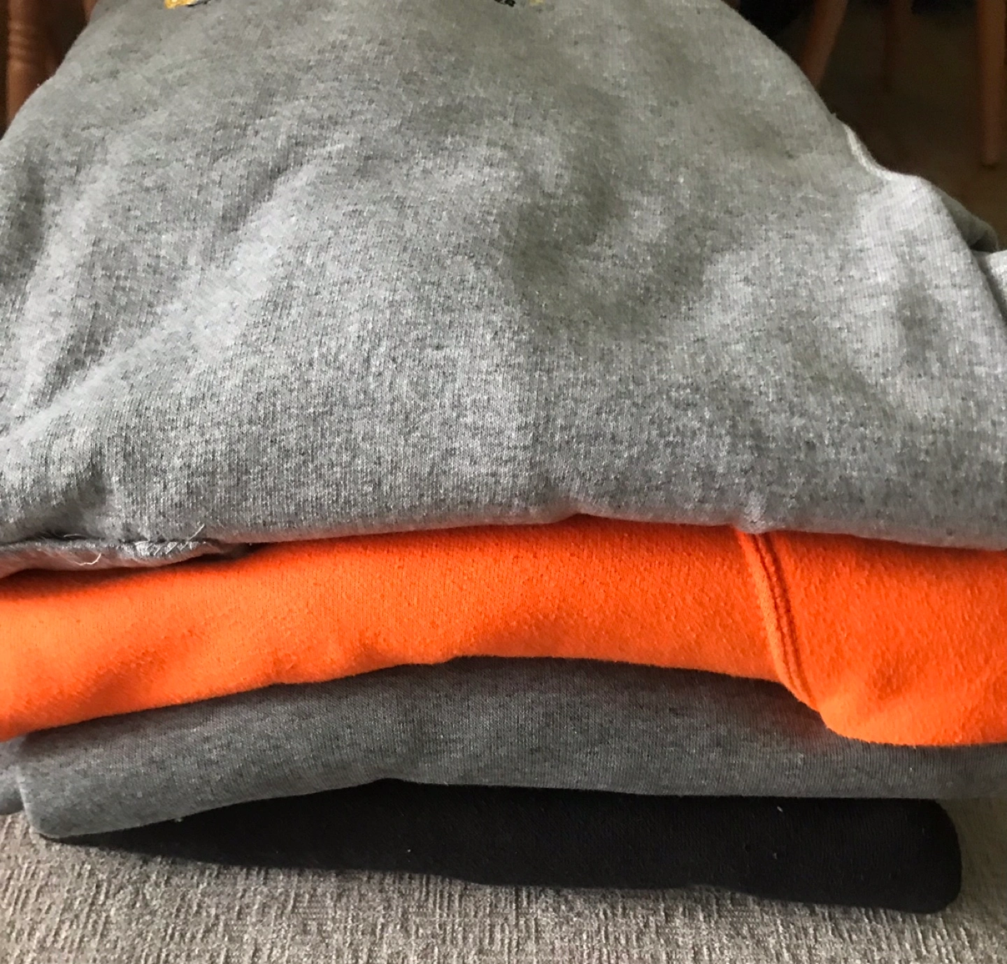 Bundle of four sweatshirts. Grey, orange, grey and black. All long sleeve. Free. It’s good for mens work in construction.