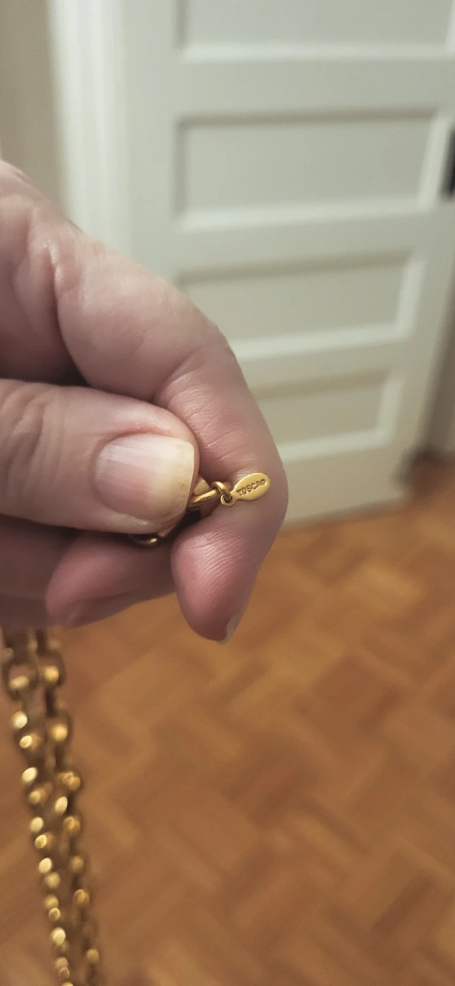 This long necklace features a gold-tone chain with alternating links and clear, round beaded sections. The clasp has a small tag with the "Yosca" logo. It's a statement piece that adds a touch of elegance to any outfit.