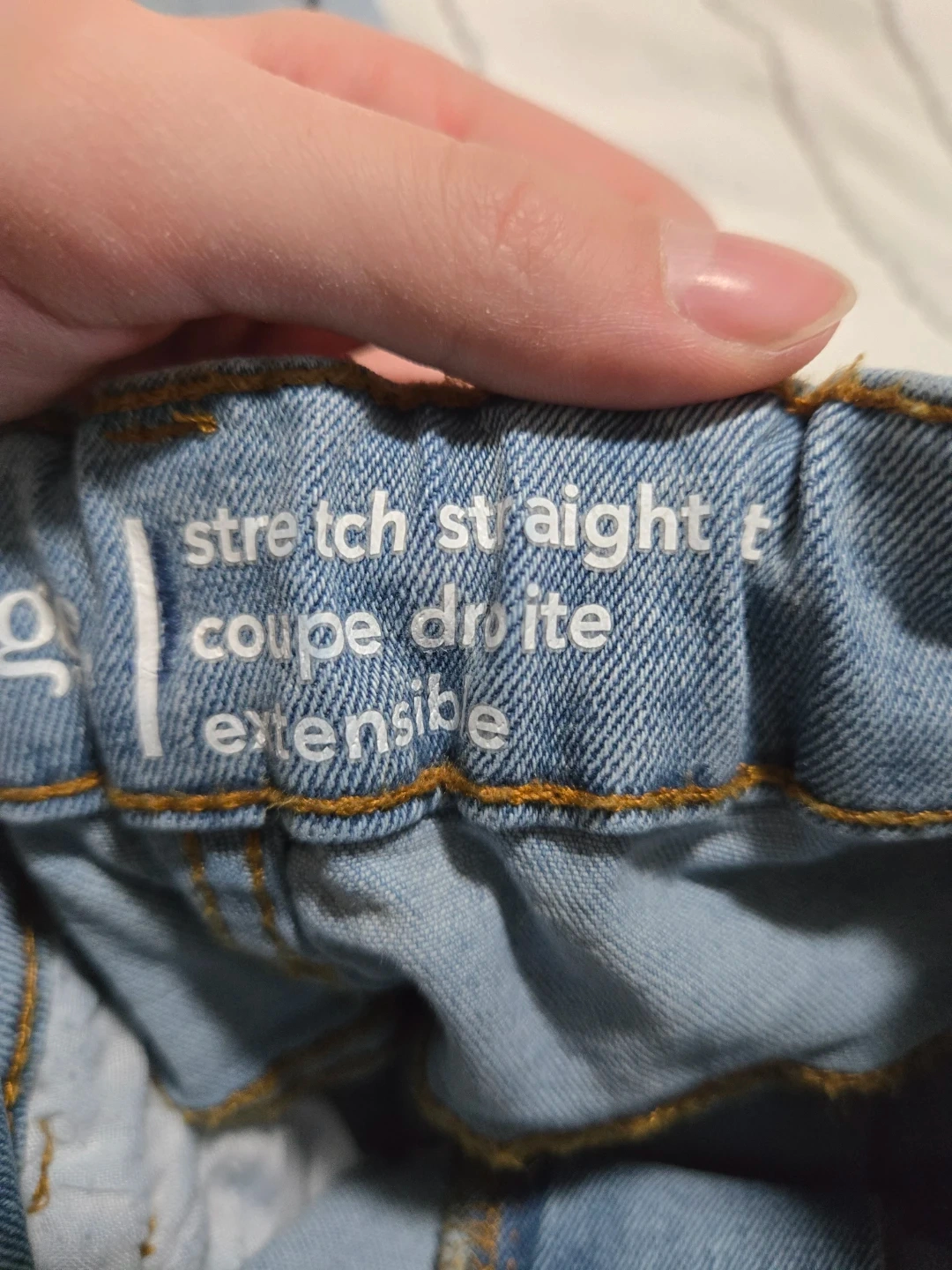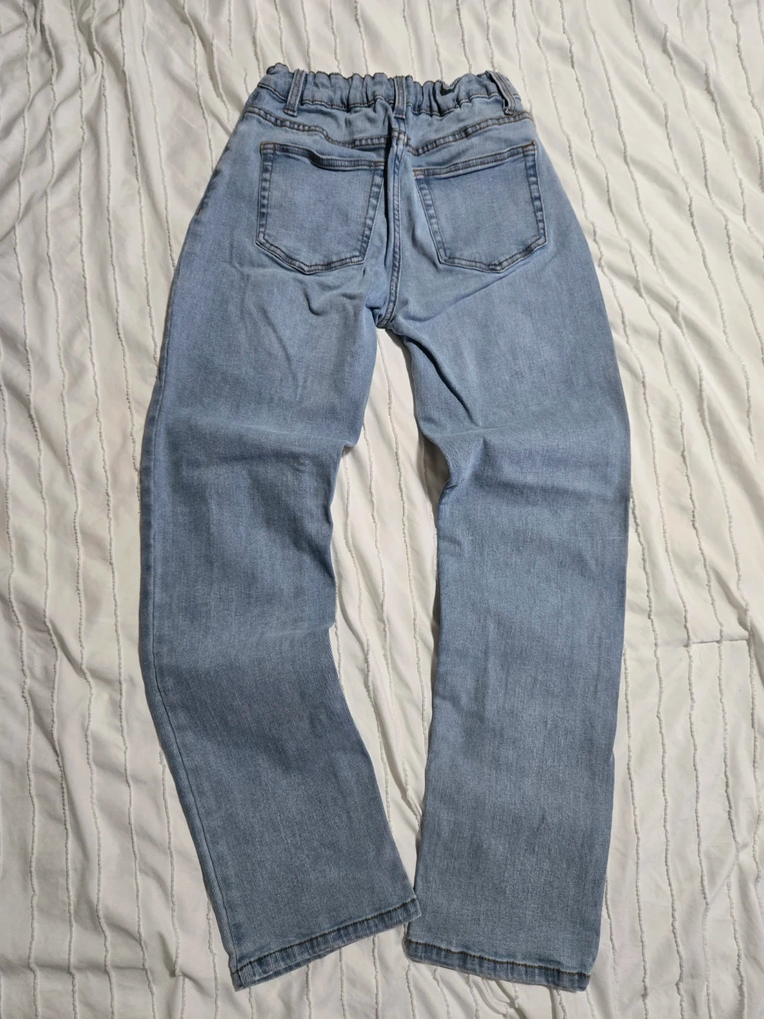 These light wash denim jeans are a straight leg cut. They're made with stretch fabric for comfort. The elastic waistband makes them easy to pull on and off.