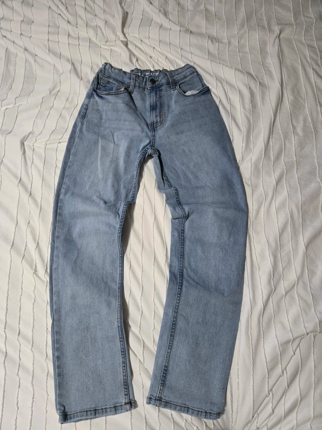 These light wash denim jeans are a straight leg cut. They're made with stretch fabric for comfort. The elastic waistband makes them easy to pull on and off.