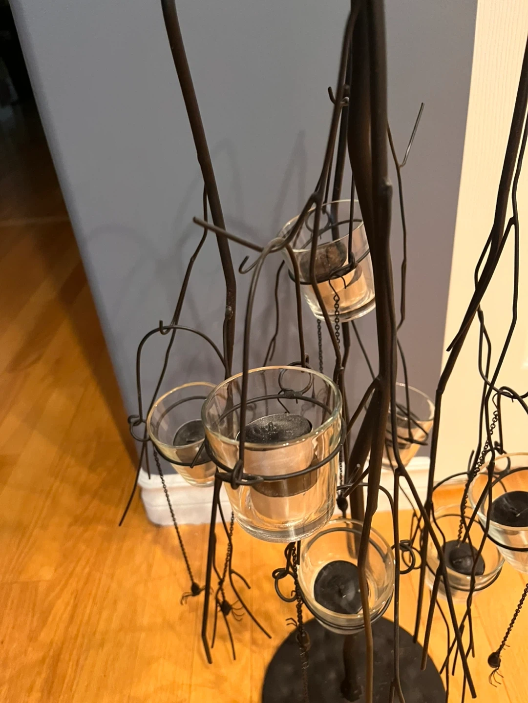 This black metal candle holder has a tree-like design with hanging glass cups for tealights and decorative spiders. It's perfect for creating a spooky atmosphere during Halloween. Measures approximately 2.5 feet tall.
