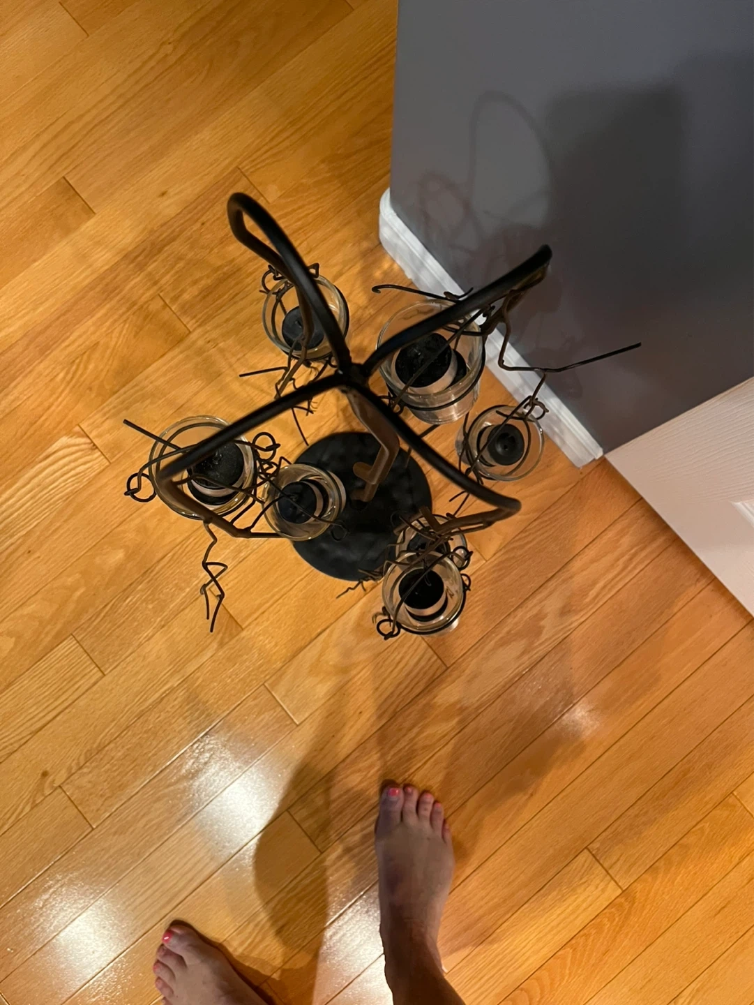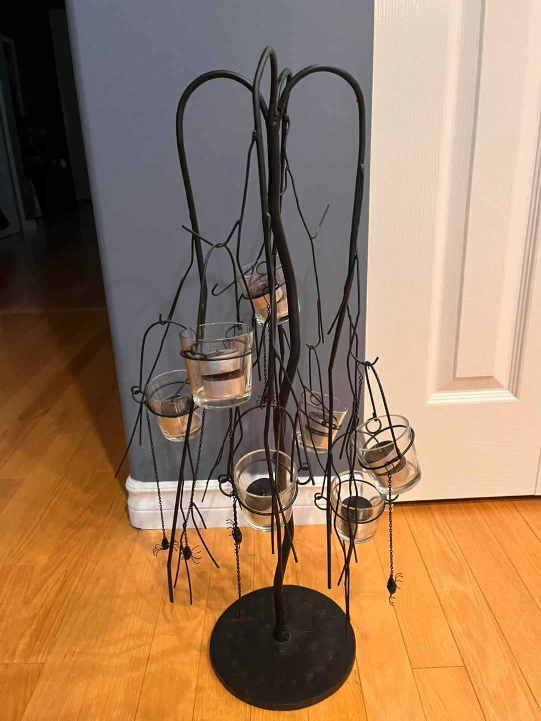 This black metal candle holder has a tree-like design with hanging glass cups for tealights and decorative spiders. It's perfect for creating a spooky atmosphere during Halloween. Measures approximately 2.5 feet tall.