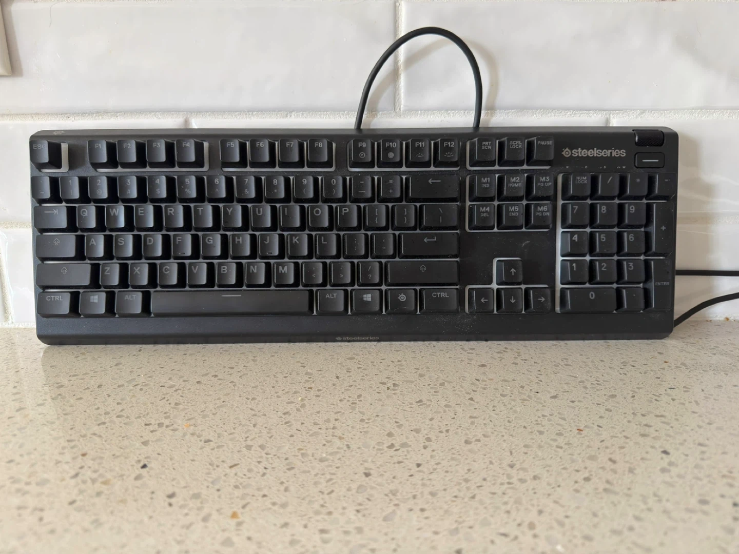 SteelSeries Apex 3 gaming keyboard with a detachable magnetic wrist rest. It's a whisper quiet keyboard with anti-ghosting capabilities and RGB illumination. Perfect for gaming sessions!